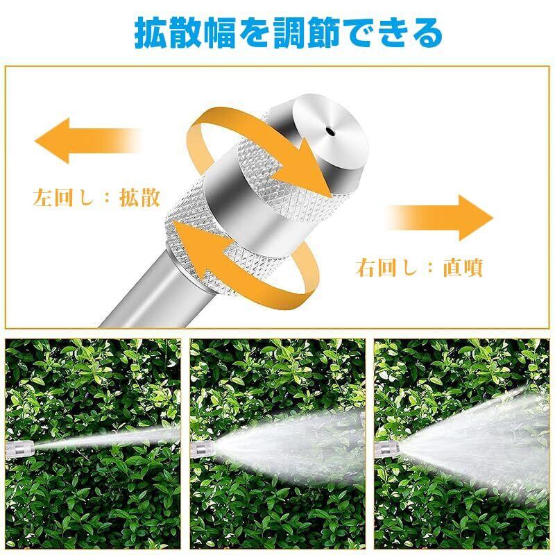 【噴霧の幅を調整できる】この洗車ガンは用途に合わせて噴射拡散幅を可変することができます。広角のミスト噴射から狭角のジェット噴射までノズル先端のノブを回転させることで調整可能です。