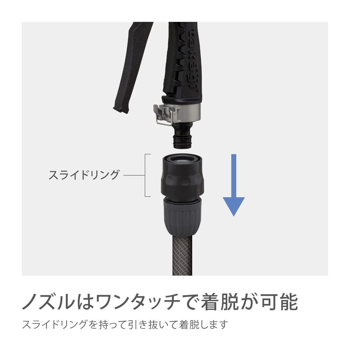 ラバーグリップで手にフィットする使い心地にもこだわったタフギアメタルノズル。