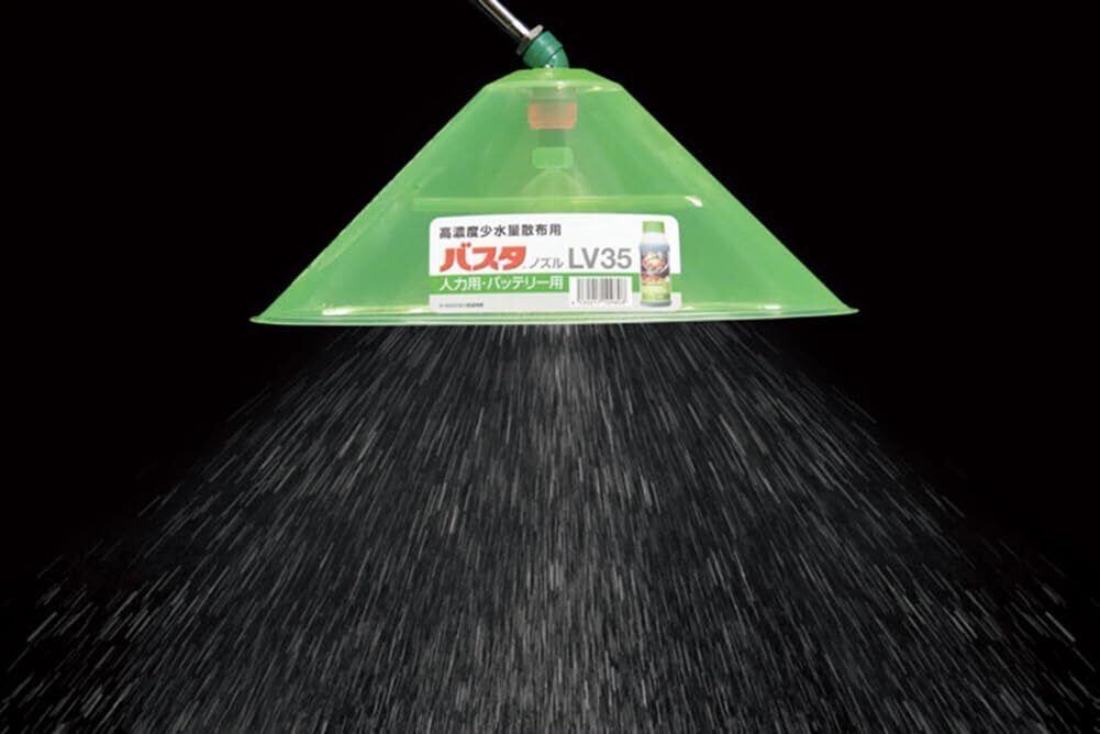 ■加圧式噴霧器・バッテリー動噴対応タイプ//高濃度30~40倍希釈液を10a当り30~40Lの少水量で均一散布!//特長/●栽培作物や人体への飛散を抑えたバスタ(R)液剤専用ノズルです。/●10a当り30~40Lの散布に最適です。(高濃度30~40倍希釈液)/●散布液はドリフト(飛散)が少なく、散布跡が白く見えるため、散布ムラや重複散布を防ぎます。/●ノズルがカバーの外側より見え、散布時に草や噴霧状態が確認できます。/●軽量化のため、エルボに高強度樹脂を採用しています。/●散布幅に合わせてエルボの向きを自由に変更できます。(エルボを回転させてもカバーと霧の平行がずれません。)/●ノズル部に方向合わせ溝がついているため、ノズルをしてもカバーと霧の平行がずれません。//<ドリフト低減推奨品>//※(R)はBASF社の登録です。/////
