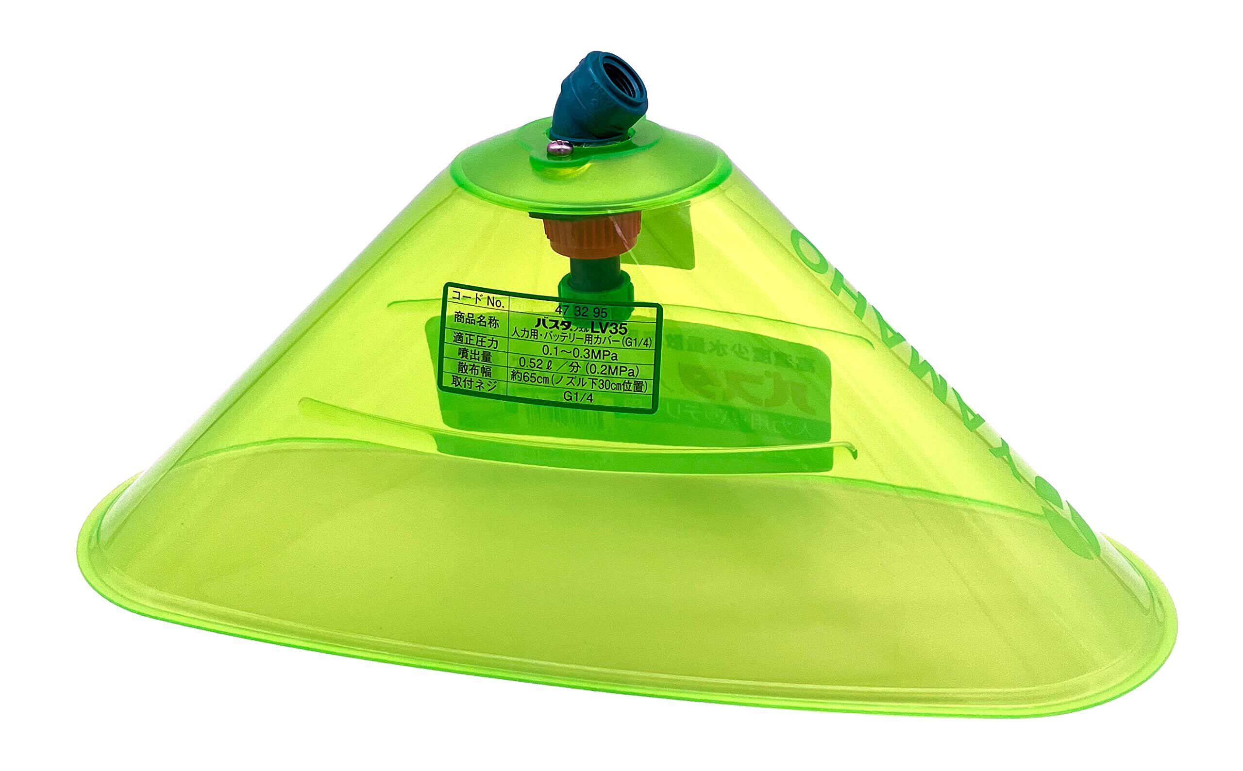 メーカー:ヤマホ工業//品名:バスタノズルLV35カバー (人力・バッテリー用)//品番:473295//JANコード:4530217109808//本体サイズ(全長×全高×全幅):約320×150×130mm//重量:約0.104kg//ノズル名称:N-KAL-9BGR//平均粒子径(μm):792(0.2MPa)//適正圧力(MPa):0.1~0.3//噴出量:0.52 L/分 (0.2MPa)//散布幅:約65cm(※散布幅はノズルからの距離が30cmでの数値)//取付ネジ:G1/4/