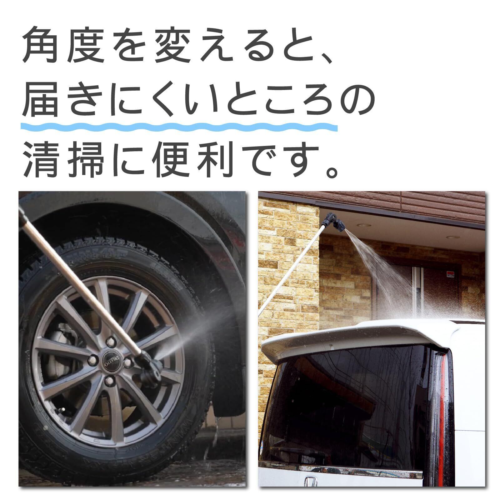 【角度調整機能付き】ノズルの先端は270°角度調整が可能で、普段届きにくい場所や見えにくい場所の洗浄もより簡単に行えます。