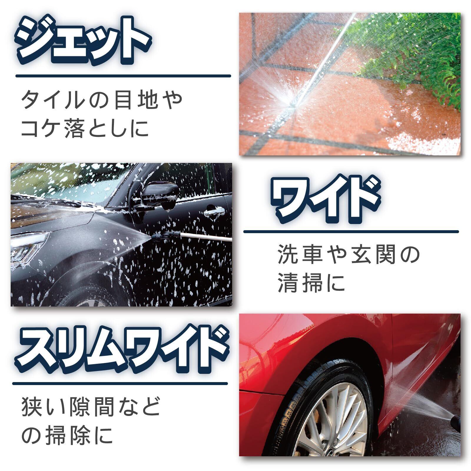 【3つの水形切り替え可能】先端を回すことで高水圧のジェット、スリムワイド、ワイドに変更可能。用途に合わせて使い分けいただけます。