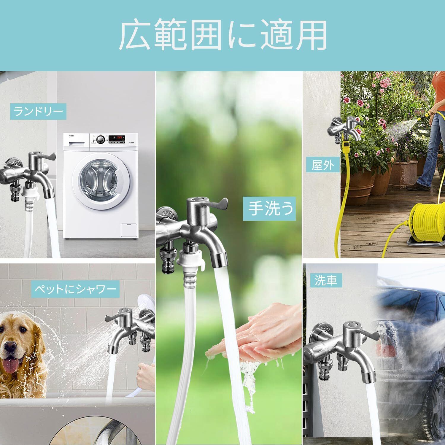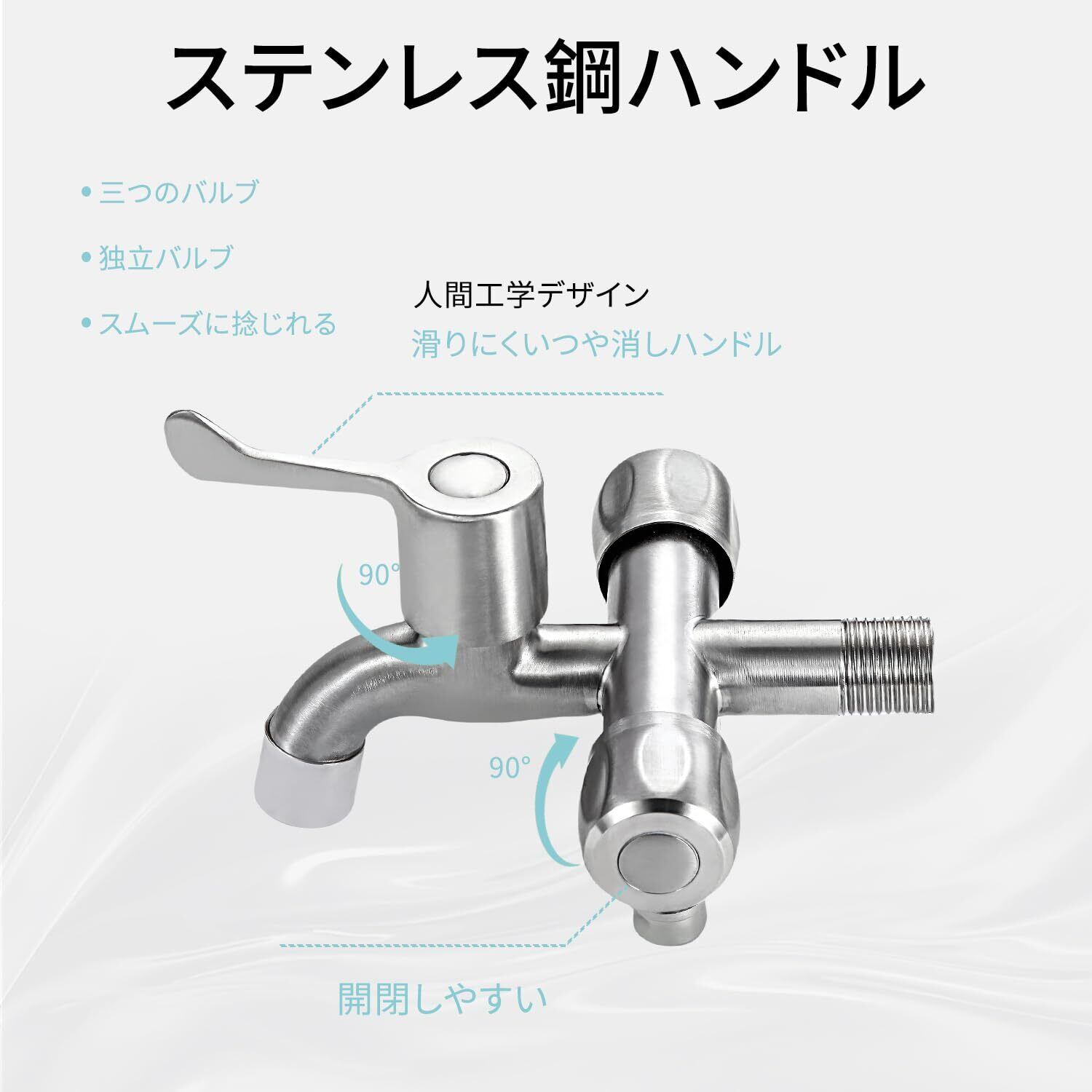 【漏水防止&独立したハンドル】蛇口出口にはフィルターを採用し、水流を柔らかくするとともに、蛇口の水漏れを効果的に防ぎます。独立したハンドルなので一方を洗濯機、もう一方を散水などの給水ホースに利用できます。
