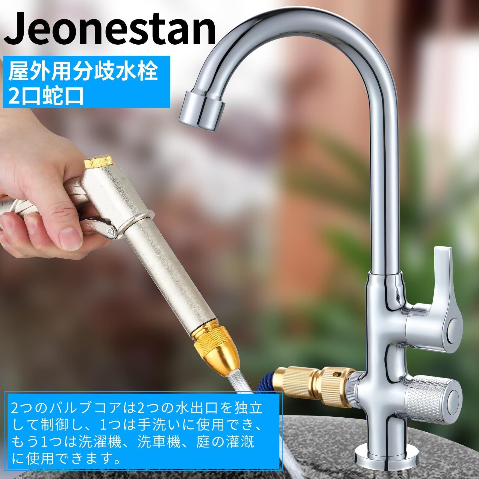 【二口水栓デザイン】普通のツル首水栓と異なり、この2分歧蛇口はおしゃれなデザインで、2つの高品質な真鍮バルブコアが独立して给水を制御します。スワン型吐水パイプラインは360度回転可能で、第二世代ボールベアリングを内蔵し、回転がスムーズでクリック音がします。蛇口先端には泡沫金具が付き、水流が柔らかく飛散せず、手洗いや洗面、バケツへの給水に適しています。蛇口ニップルはタカギ標準を採用し、洗濯機ホースや散水ホースに接続可能で、洗車にも使用できます。
