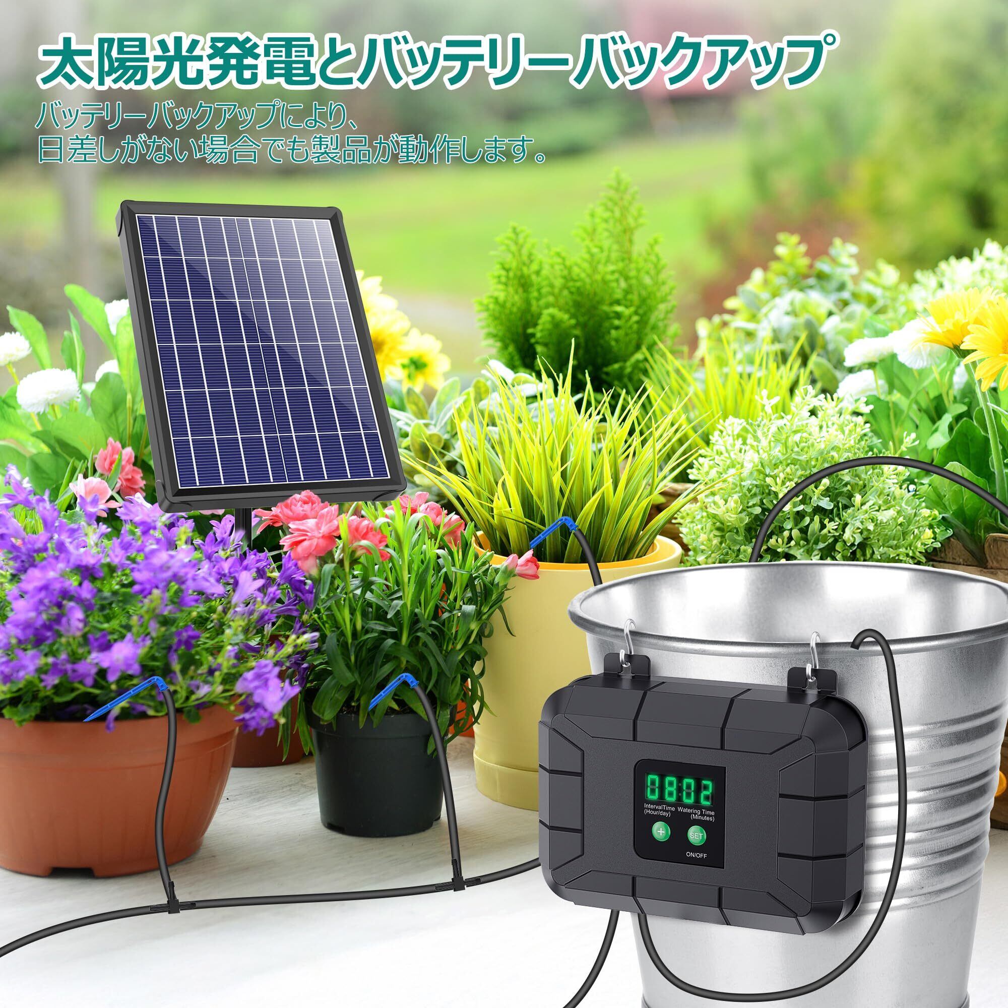 電源不要・メンテナンス簡単:ソーラー充電式のため、コンセントや配線が不要。水タンクの残量確認だけでOK、面倒な水やり作業から解放されます。 忙しい方やガーデニング初心者に最適!水やり忘れや過剰灌漑を防ぎ、植物を最適な環境で育てます。