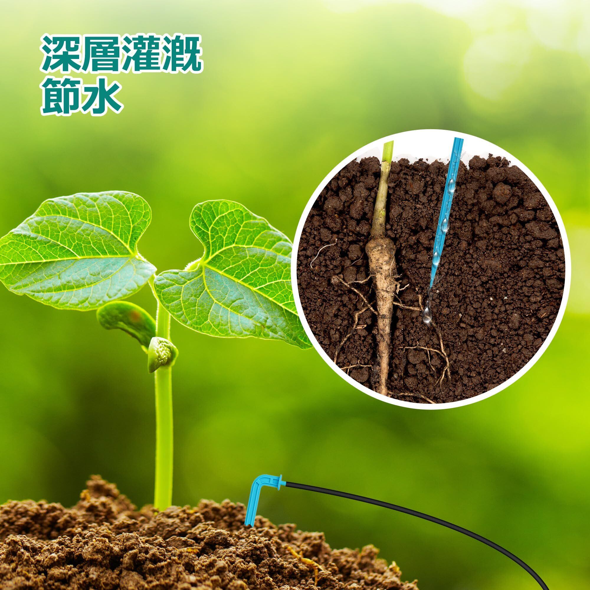節水型 点滴灌漑システム:800-900mL/分の調整可能な流量で、水を無駄にせず根元へ直接給水。深層灌漑で植物の健康を促進し、従来比最大50%の節水が可能。