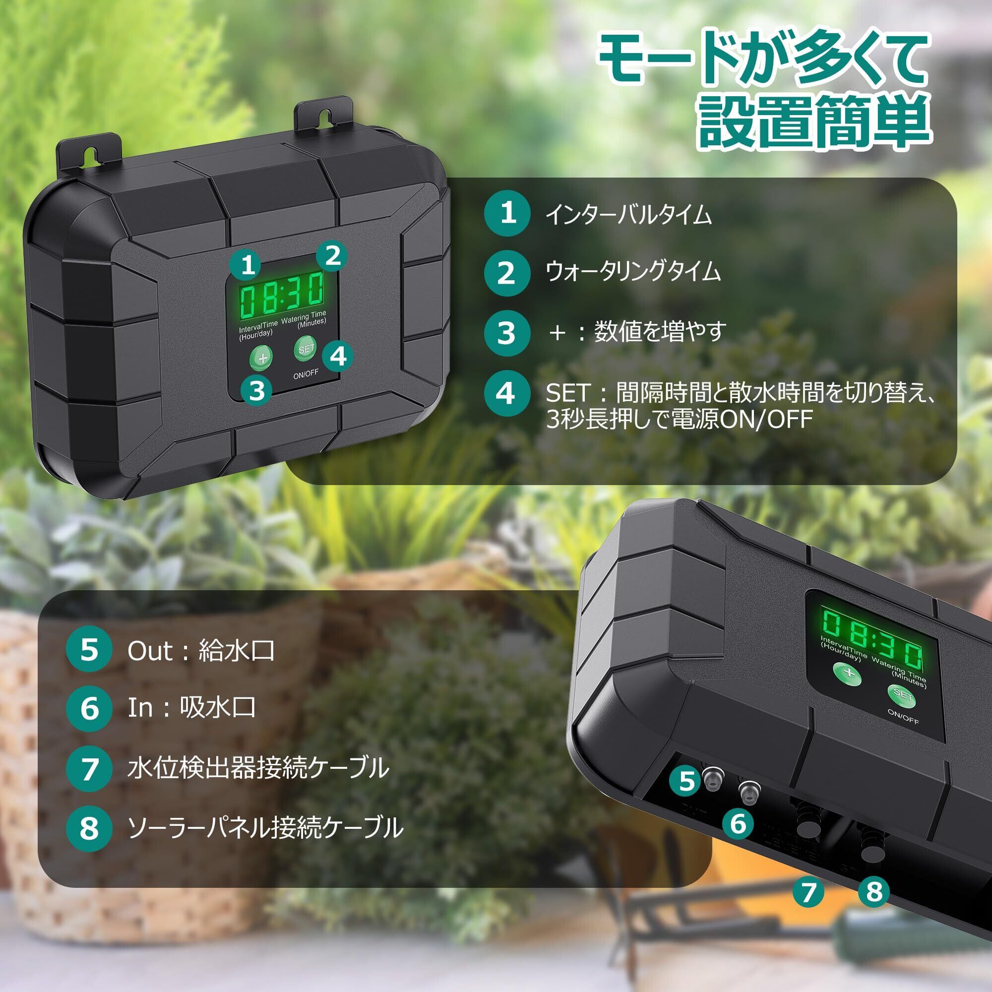 ⏰ 完全自動散水&カスタマイズ可能:最大15鉢まで対応、設定したスケジュールで手間なし自動水やり。「SET」ボタンで散水時間・間隔を簡単調整(夏場/冬場の水量切り替えも容易)。
