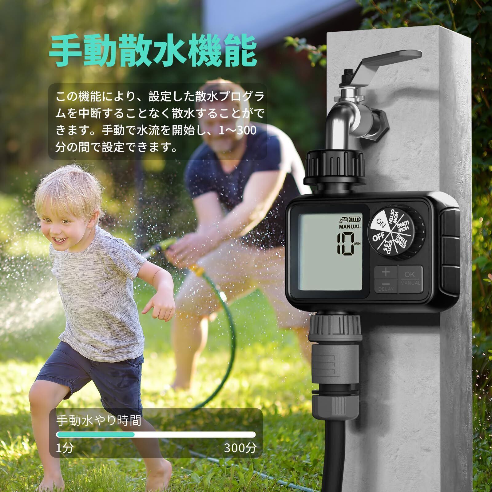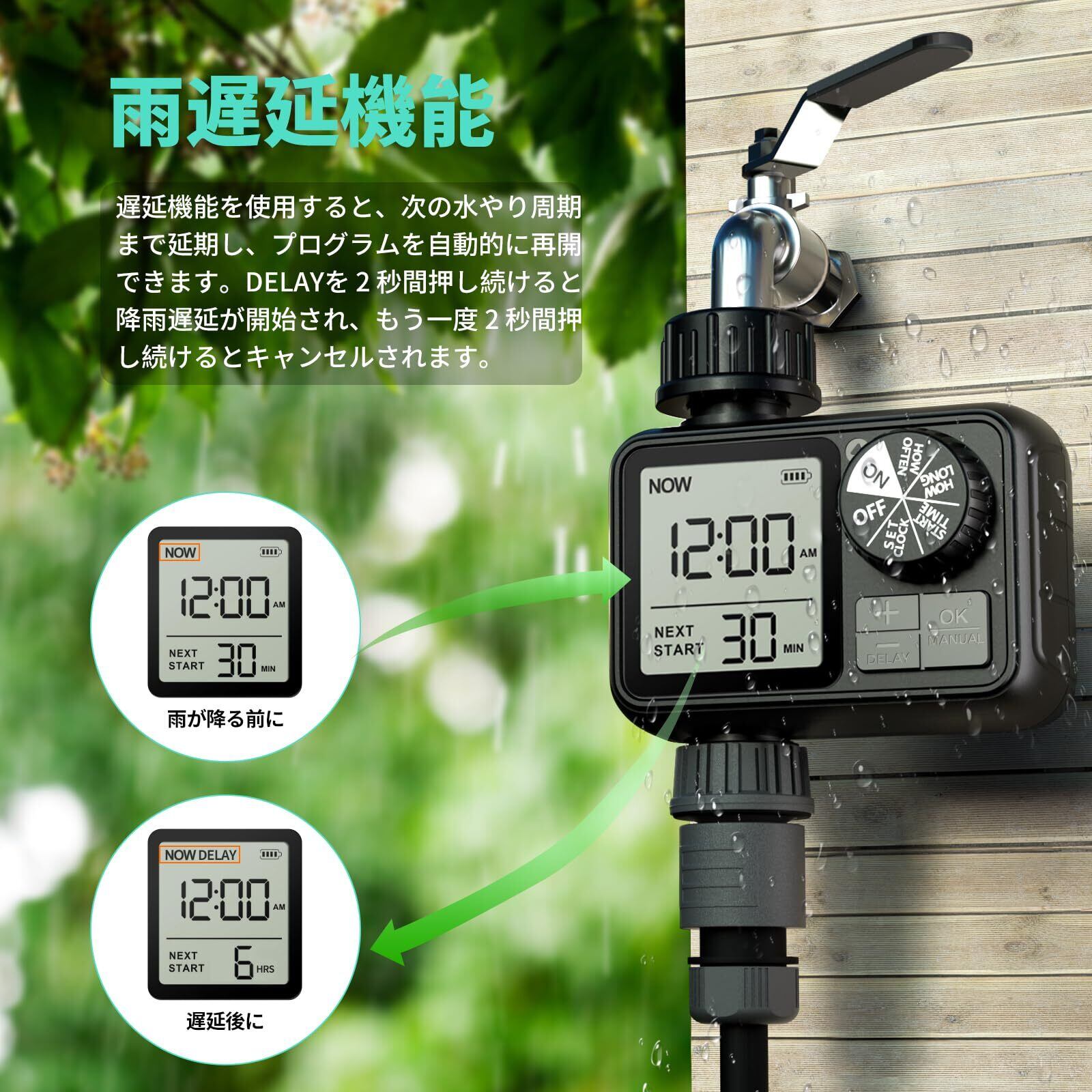 【降雨遅延 手動モード】:降雨遅延機能を備えており、OKボタンを2秒間長押しすることで次の散水サイクルをスキップして水を節約できます。手動モードでは、1分から360分までの散水時間をカスタマイズでき、散水のニーズに柔軟に対応します。