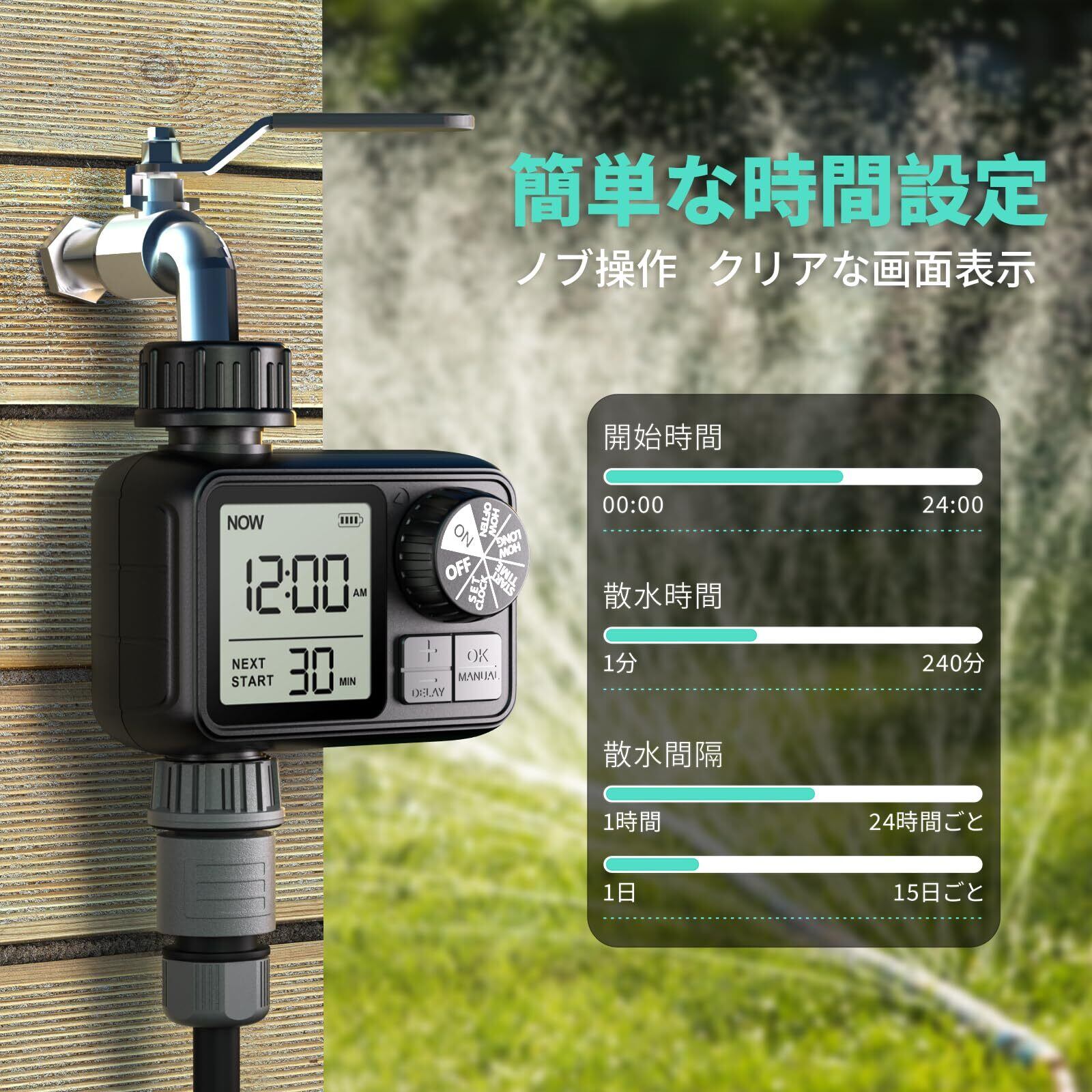【簡単プログラミング】:つまみ操作、簡単で使いやすい。 散水時长 : 1分~240分 ,水やり間隔 : 1時間~24時間ごとに1回、または1日~15日ごとに1回。