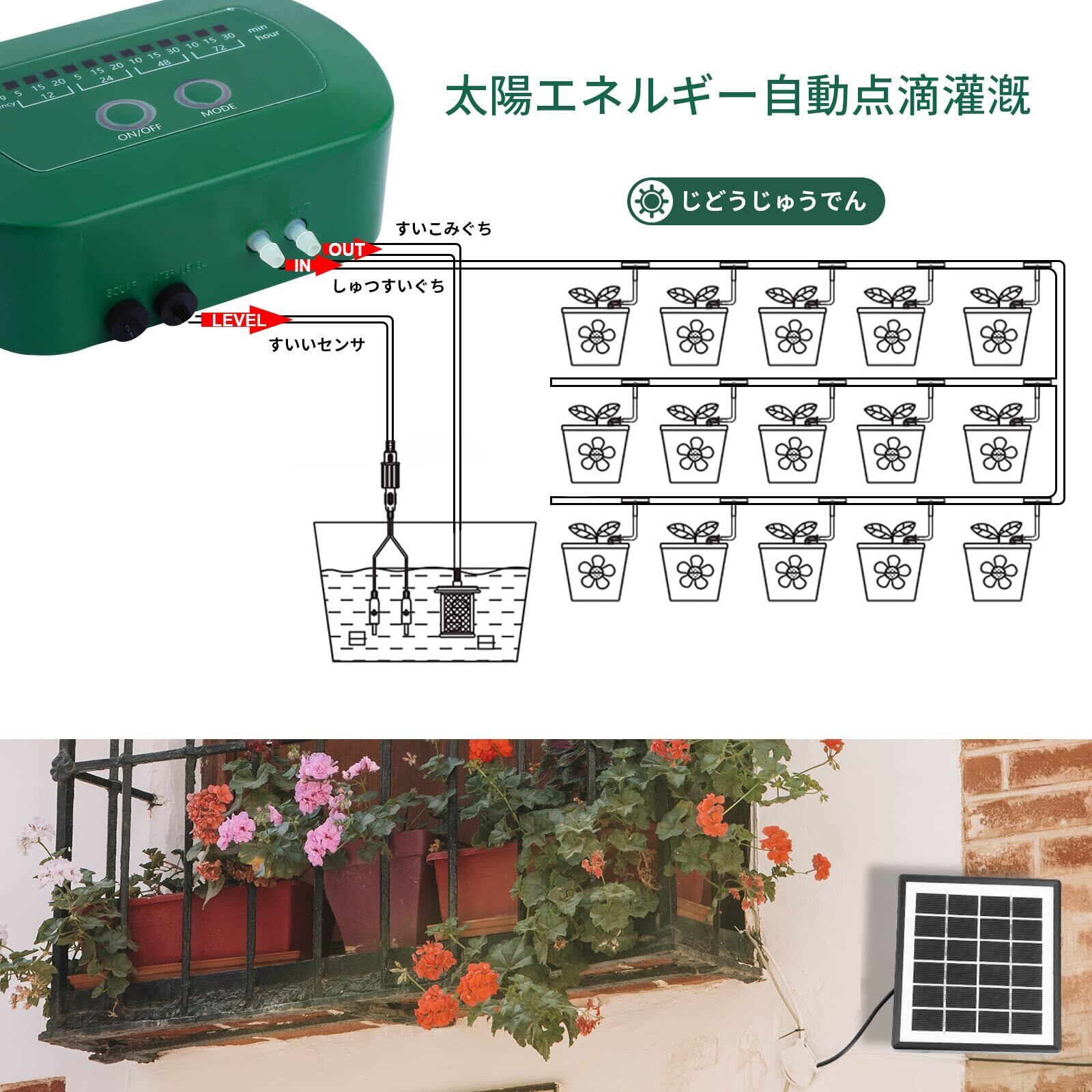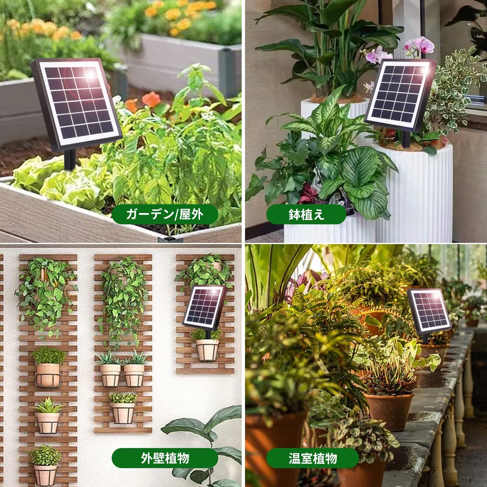 太陽光自動灌漑:太陽光給電技術を利用して、太陽電池パネルは電気エネルギーを貯蔵することができて、線組と水道管を準備したバケツの中に挿入して、時間と水量を調整して、灌漑システムは自動的に植物を灌漑します。太陽光灌漑システムの太陽電池パネルは72日間働くことができ、楽しい長期休暇を過ごすことができます。