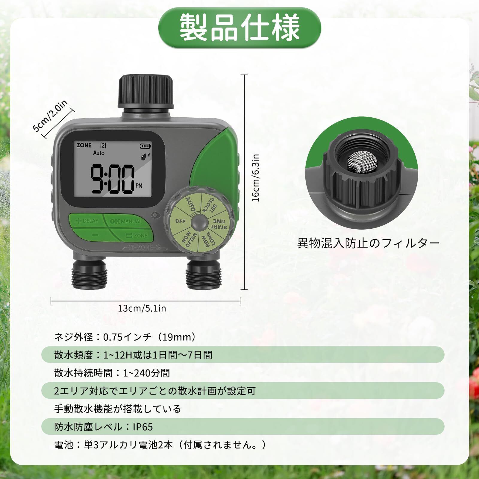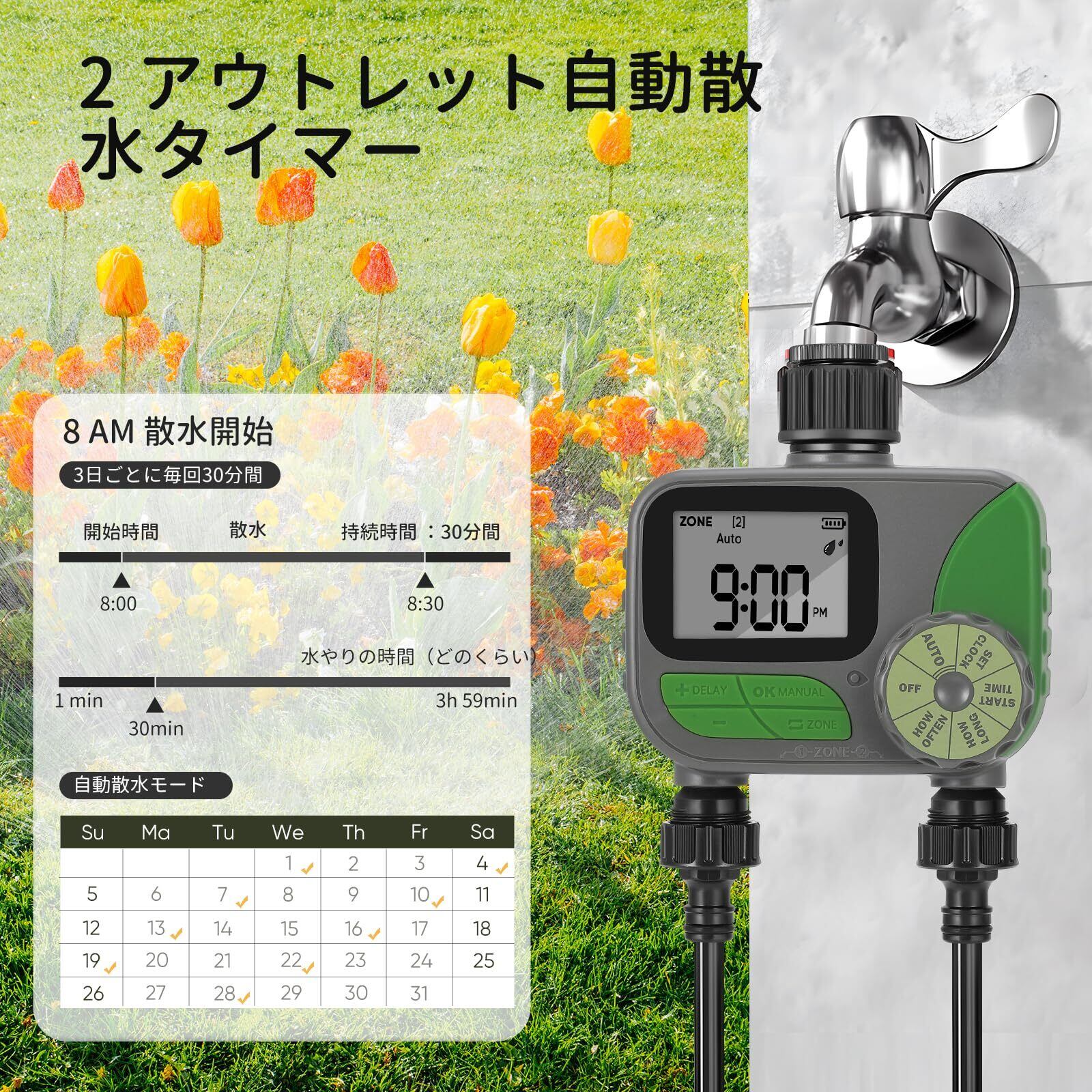 自動散水タイマー ダブルタイマー 自動水やり機 2アウトレット 大画面防水LEDパネル 鉢植え灌漑システム 給水 雨遅延散水 自動/手動室内屋外散水 畑 庭 芝生 園芸 水撒き