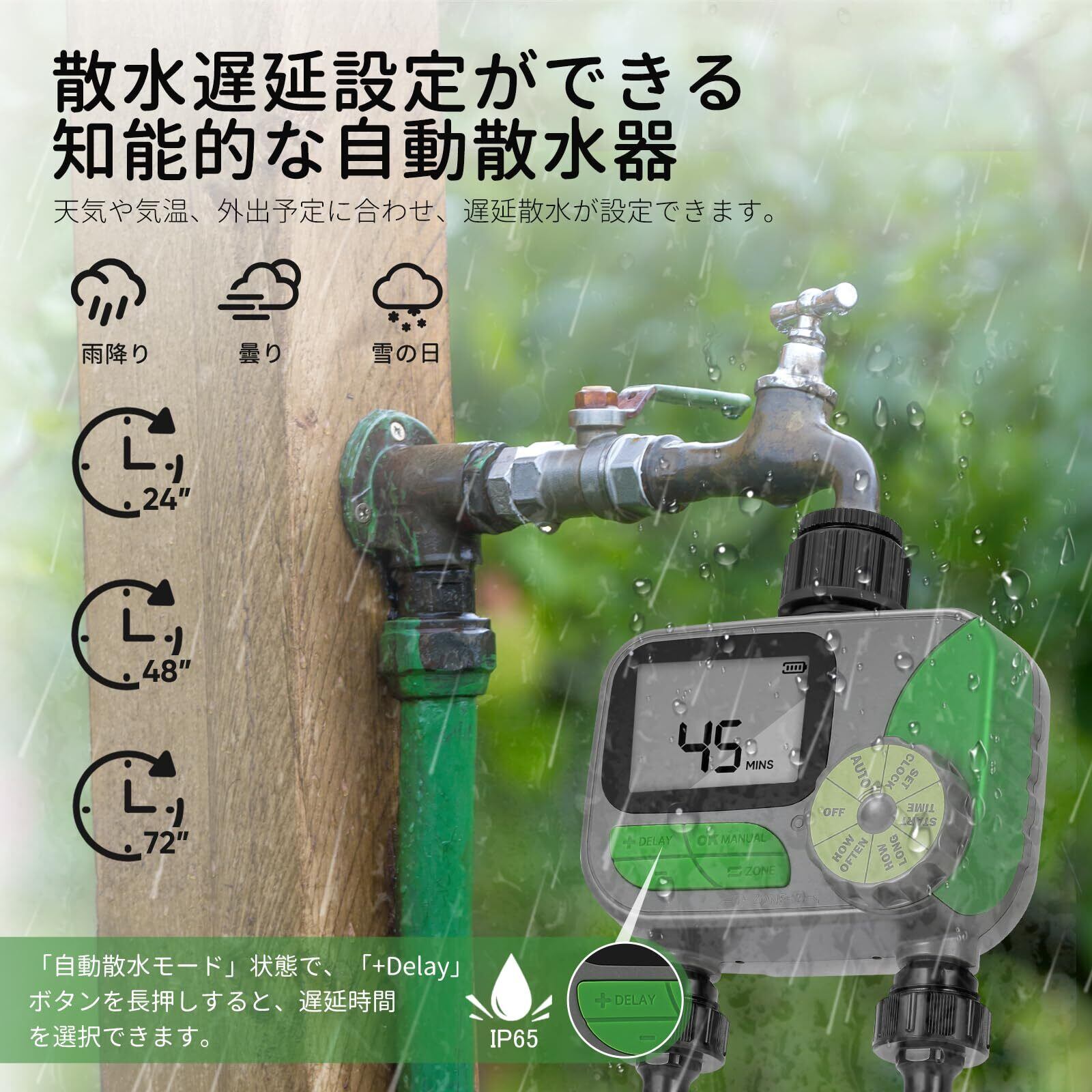 【24H/48H/72H雨遅延散水機能】自動散水システムは、1分から3時間59分までの持続時間と、1時間から12時間または1日から7日までの頻度で水をやるように設定することができます。設定に基づいて自動的に水をやるようになります。さらに、散水タイマーには遅延散水機能があり、過水やりを避けるために、雨の日に24時間、48時間または72時間間水やりをスキップすることができます。