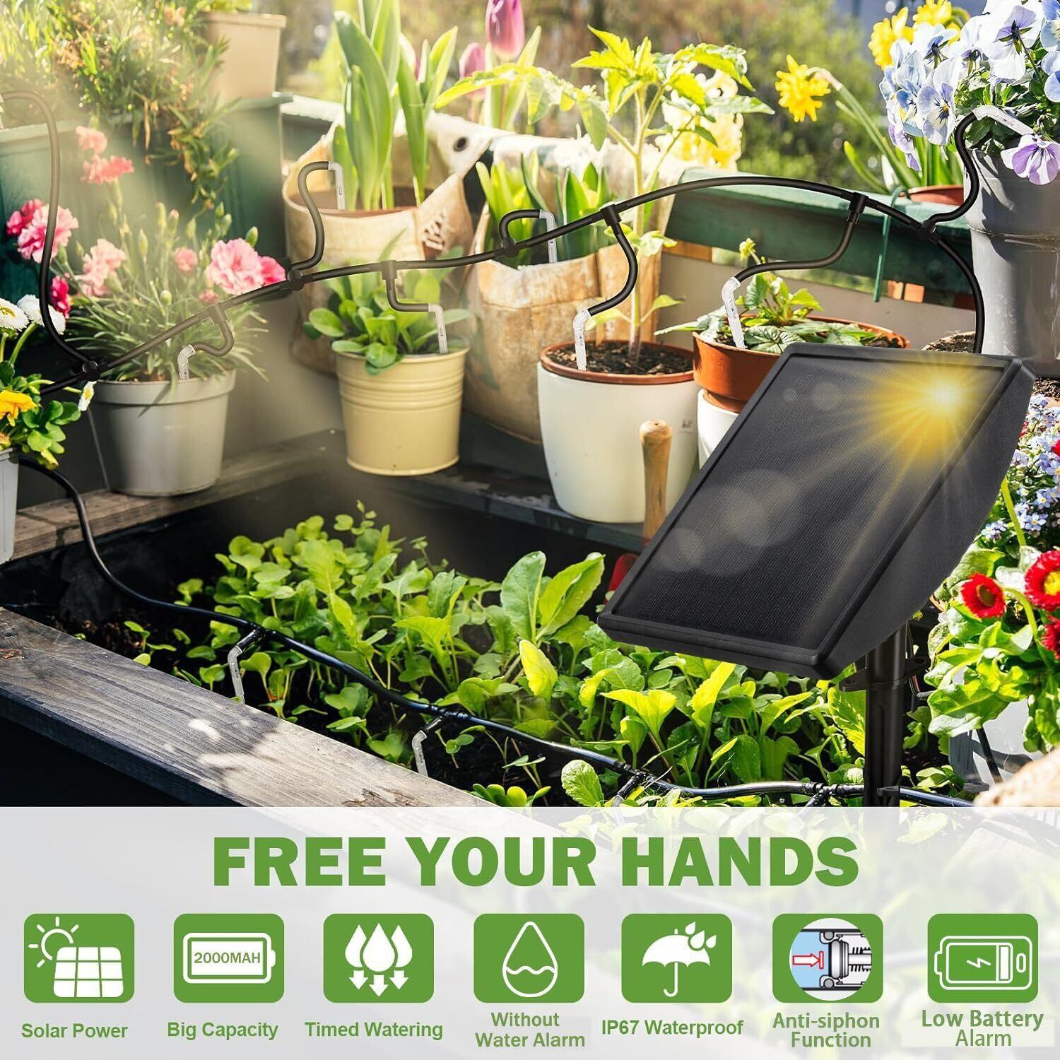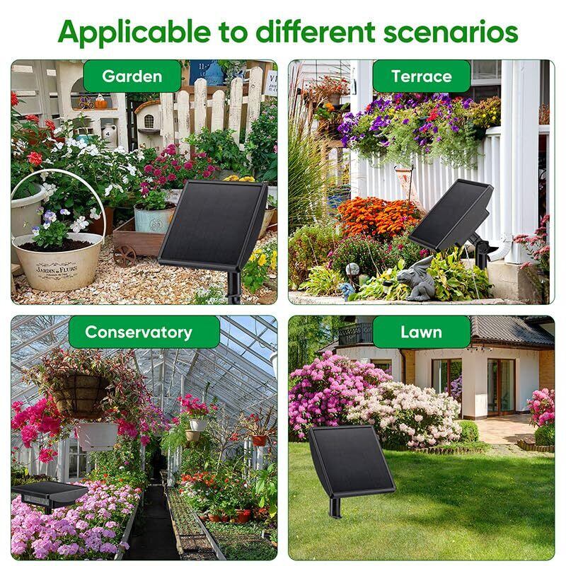 2024改良型太陽光植物自動点滴灌漑キット これは太陽エネルギーで、蛇口を必要とせずにバケツなどの容器から直接取水することができます。事前に設定された時間間隔と水量に基づいて植物に自動的に水をかけ、ポンプがアイドル状態になったりタンクが水不足になったりしたときに自動的に警報を出すことができます。ベランダ、テラス、蛇口や固定電源のない小さなガーデンの完璧な設備