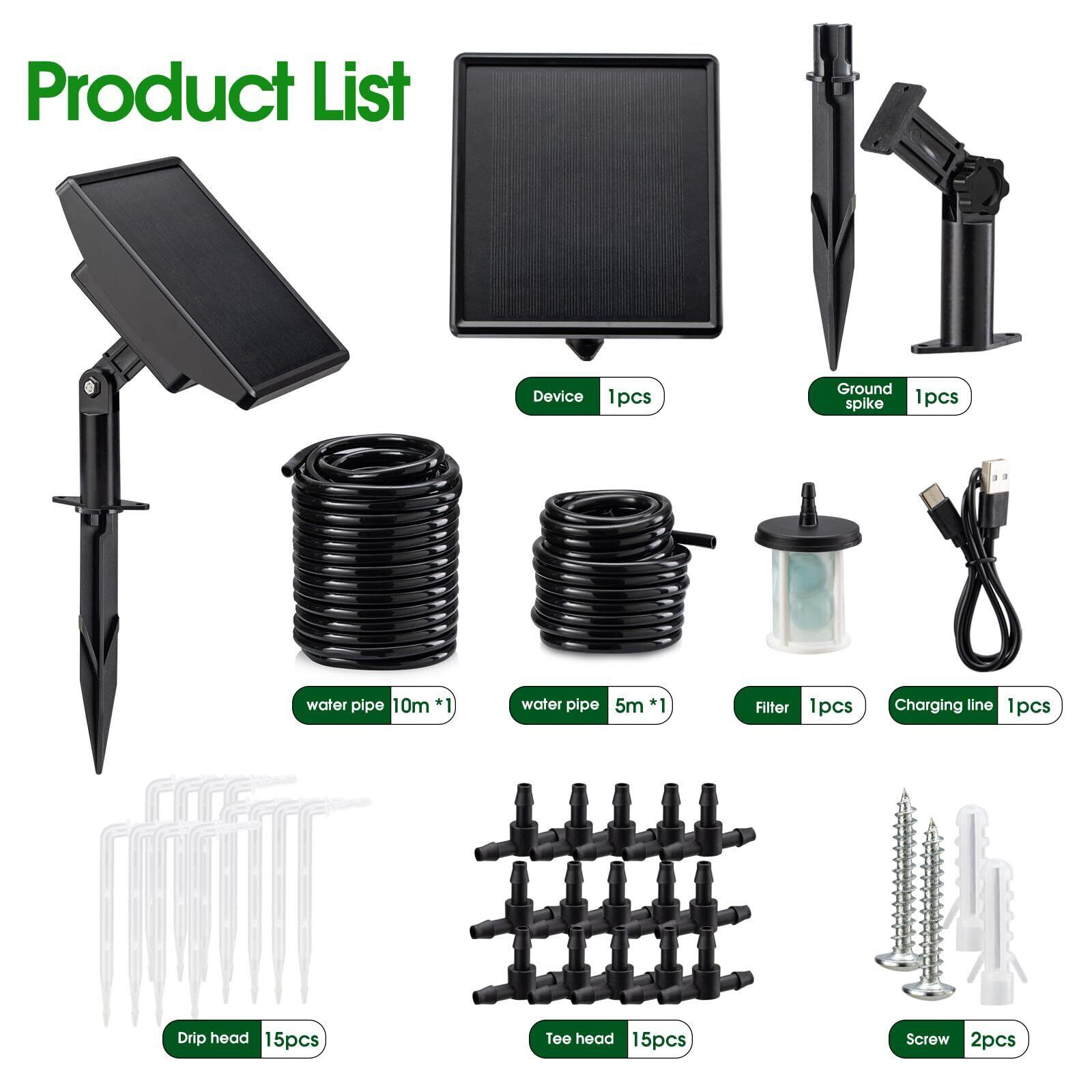 ソーラー式自動散水タイマー, 15鉢対応, 15m散水ホース付き, 屋内外兼用, 植物自動水やりシステム 自動灌漑装置 自動散水機 家庭用 ガーデニング用品 水やりシステム 留守 鉢植え給水 (ブラック)