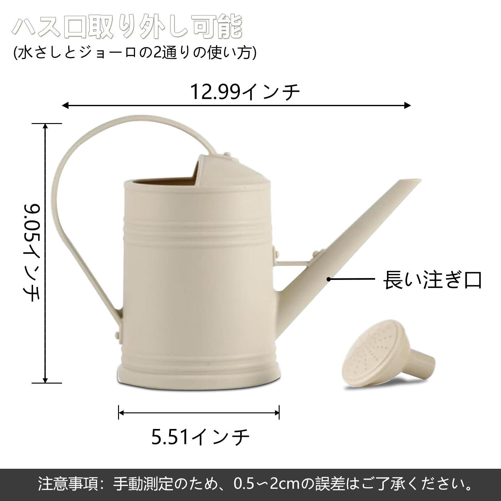 【サイズ】直径33cm。底部直径14cm。高23cm。容量:2000ml。ほとんどの植物や果物を満足させるのに十分です。2Lリットルの容量で、たくさんの水を入れることができ、頻繁に水をくむ手間が省けます。このじょうろの開口が大きく、水の補充が簡単にできます。注意事項:手動測定のため、0.5〜2cmの誤差はご了承ください。ノズルが詰まりやすいため、粒子のない液体でのみ使用し、密度の高い濃縮液体では使用しないことをお勧めします。注意事項:高品質の素材のため、少し重いです。