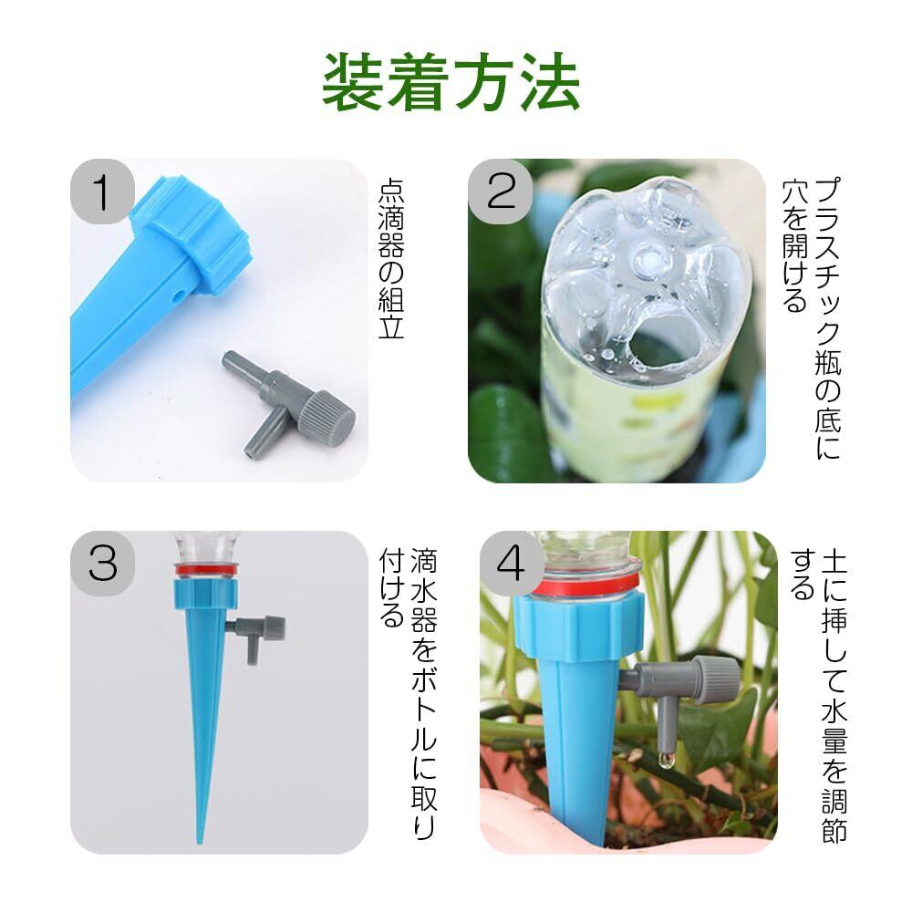 【簡単設置】専用工具不要で3ステップ完了。ボトルに穴を開け、装置を取り付け、土に差し込むだけで即時使用可能です。