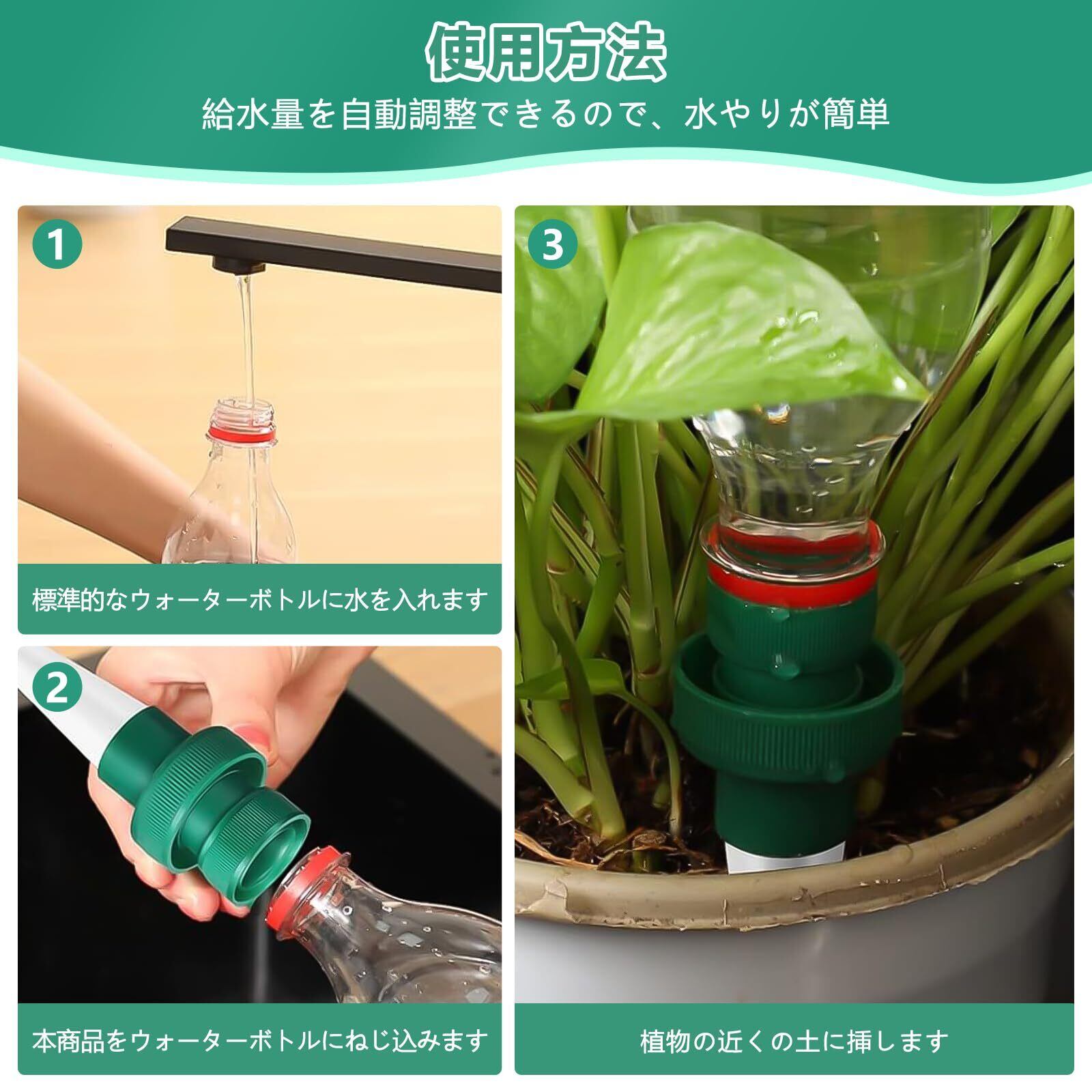 【長期間留守にしても枯れません】旅行や出張にも安心です。標準的な1リットルのペットボトルを使用して、5~7日間の給水が可能です(具体的な時間は植物の種類、鉢のサイズ、環境条件によって異なります)。5個セットで複数の鉢の植物を同時に管理でき、「帰宅後に植物が枯れている」という心配もありません。