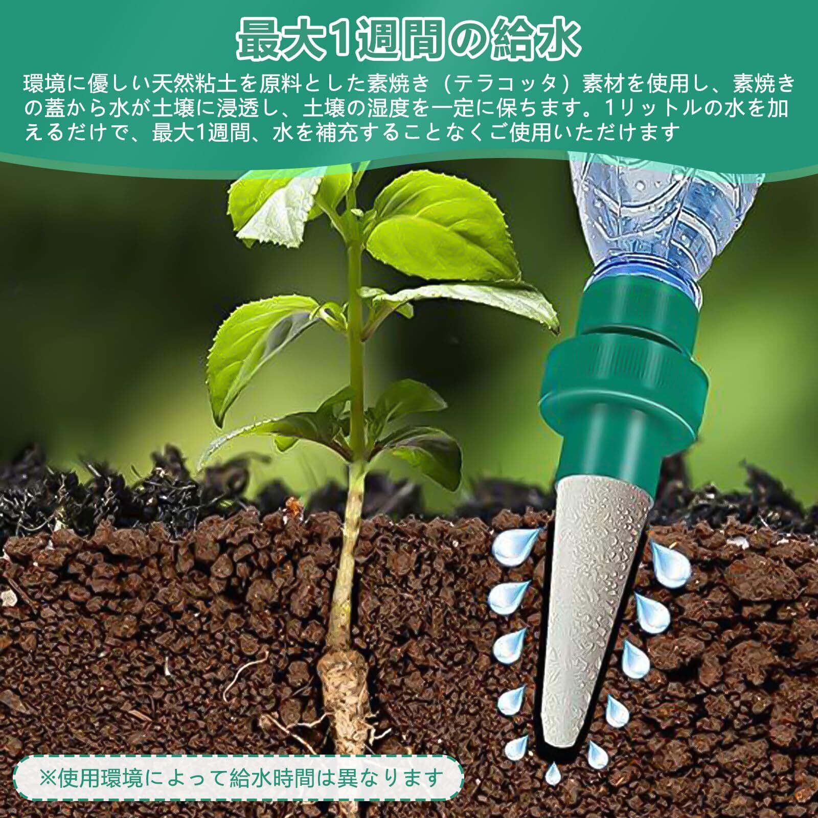 【誰でも簡単に設置できます】設置は非常に簡単です。水を入れたボトルをセラミック灌水器の上部に挿入し、灌水器を植物の土壌に差し込むだけです。ペットボトルやワインボトルなど、さまざまな種類のボトルに対応しており、屋内外の鉢植えに適しています。高齢者や女性でも、植物の生育環境を損なうことなく簡単に操作できます。