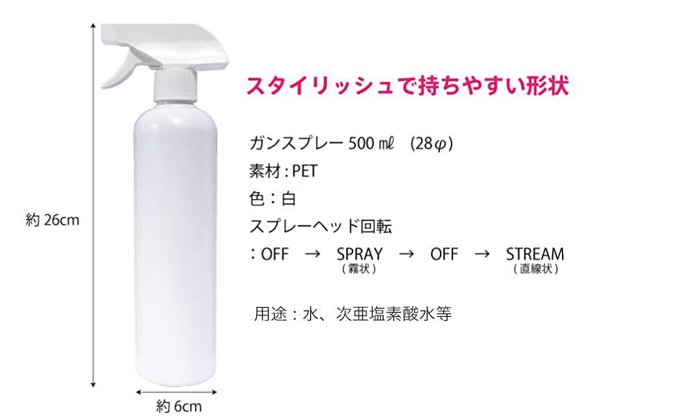 【特徴】 500mlのガンスプレーボトルです。色は白色で表面は光沢があります。素材はPETで厚みがあるのでしっかりした硬さがあります。次亜塩素酸水、水等を 入れてご使用ください。 【細かいミスト】 ミストの細かさや量もちょうど良く、使いやすいです。スプレーボトルガン先端を回転することで、霧状と直線状を切り替えられます。 【スタイリッシュデザイン】 スプレー容器胴体は細い円筒形で女性でも握りやすい。またシールを貼りやすいです。