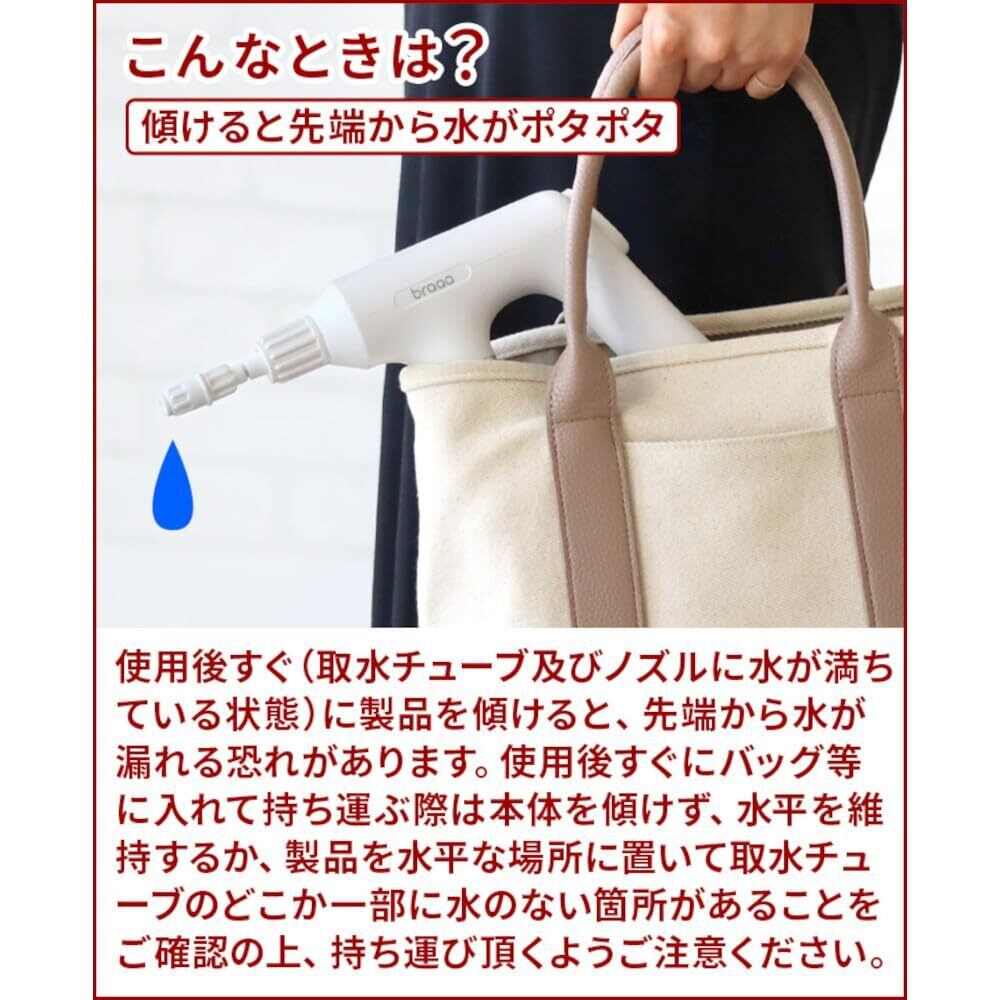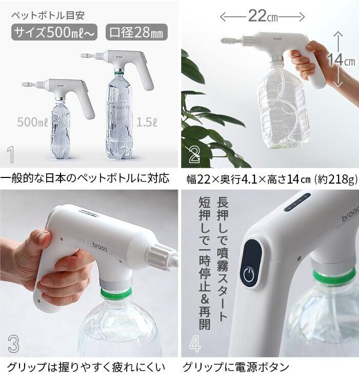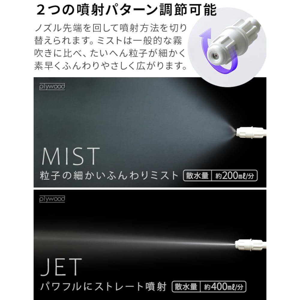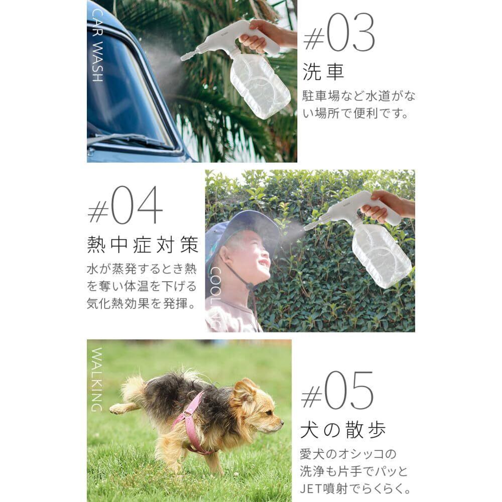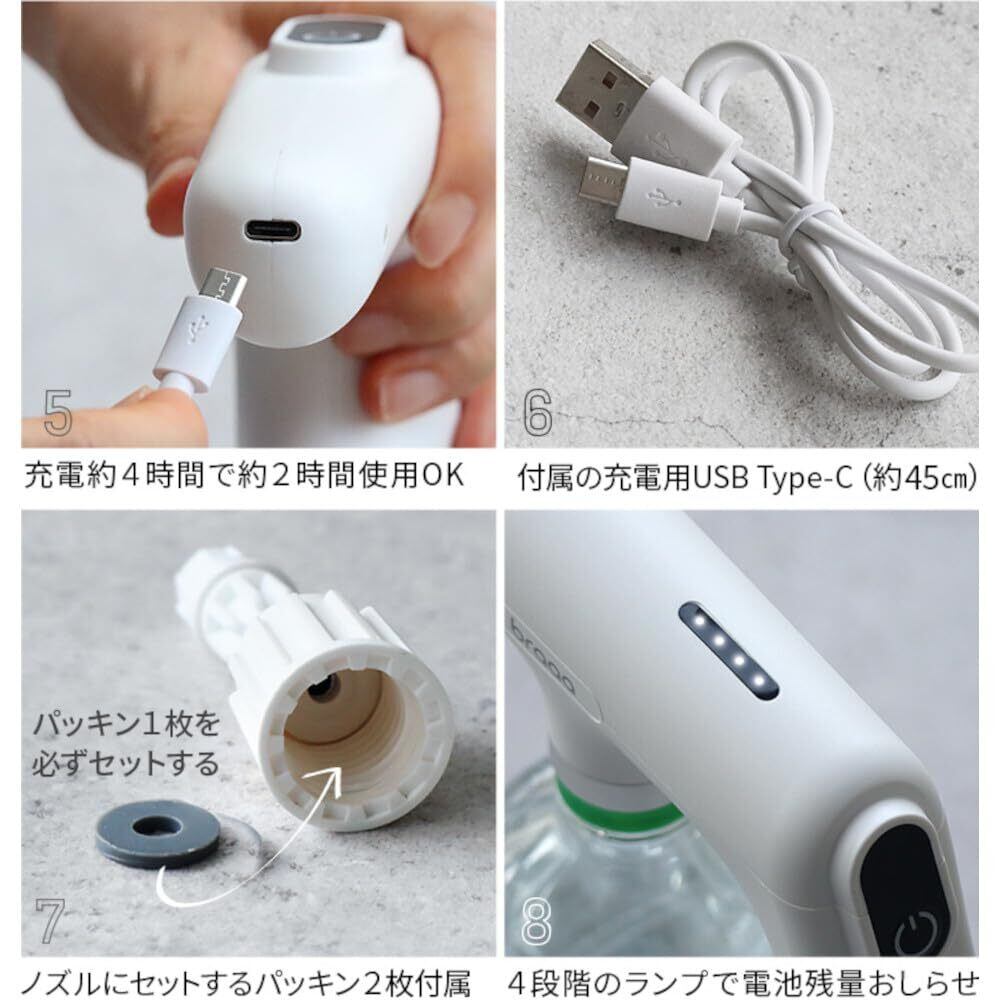 【備 考】充電時間めやす:約4時間 使用時間めやす:約2時間 水以外に アルコール消毒液・化粧水も対応 ※取扱説明書に「水道水以外は使用しないでください」と記載してますが上記液体も使用可能です。※腐食性、粘度の高い液体は入れないでください。