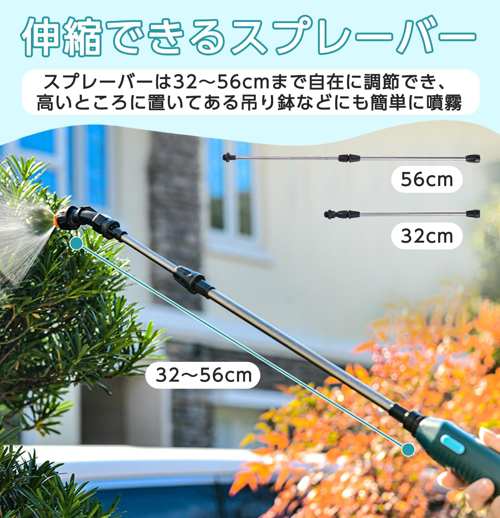 【伸縮式延長パイプ】32cmから56cmまで伸縮可能なパイプは、使用時の便利さをさらに高め、様々な高さの植物に対応可能です。家庭菜園や庭の手入れ、さらには大規模な農作業にも最適なこの噴霧器は、あらゆる水やり作業を効率的かつ快適に行うための必需品です。