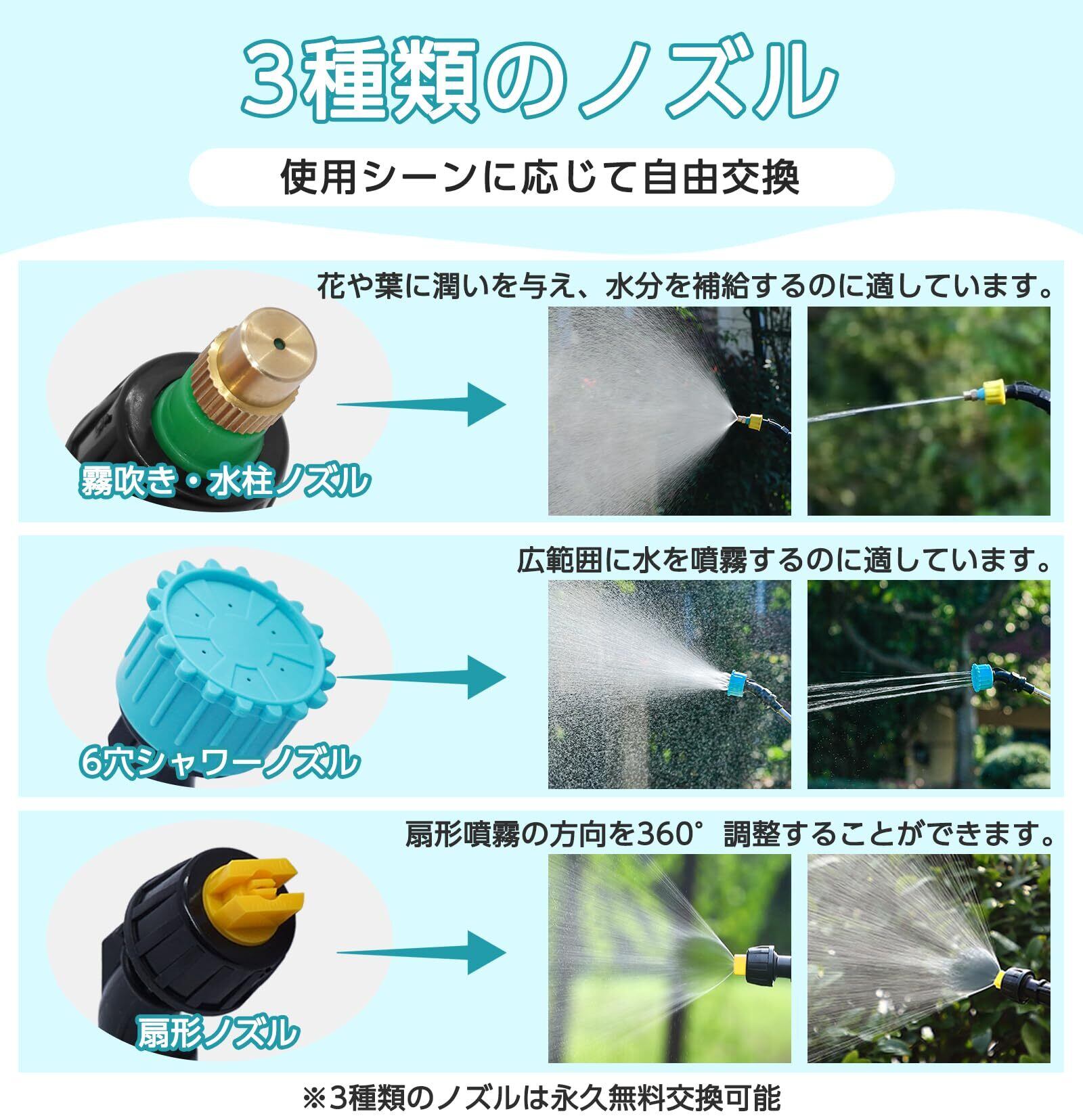 【調整可能なノズル】さらに、①霧吹き・水柱ノズル、②6穴シャワーノズル、③扇形ノズルの3種類のノズルが付属しており、異なる水やりニーズに応じて最適な水流を選択できます。ノズルを回すことで、直接スプレーから細かいミストスプレーまで、ニーズに合わせて水スプレーの強さを調整できます。