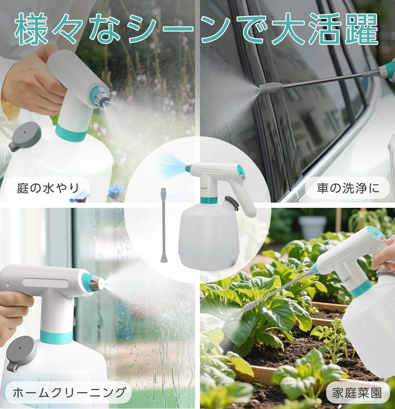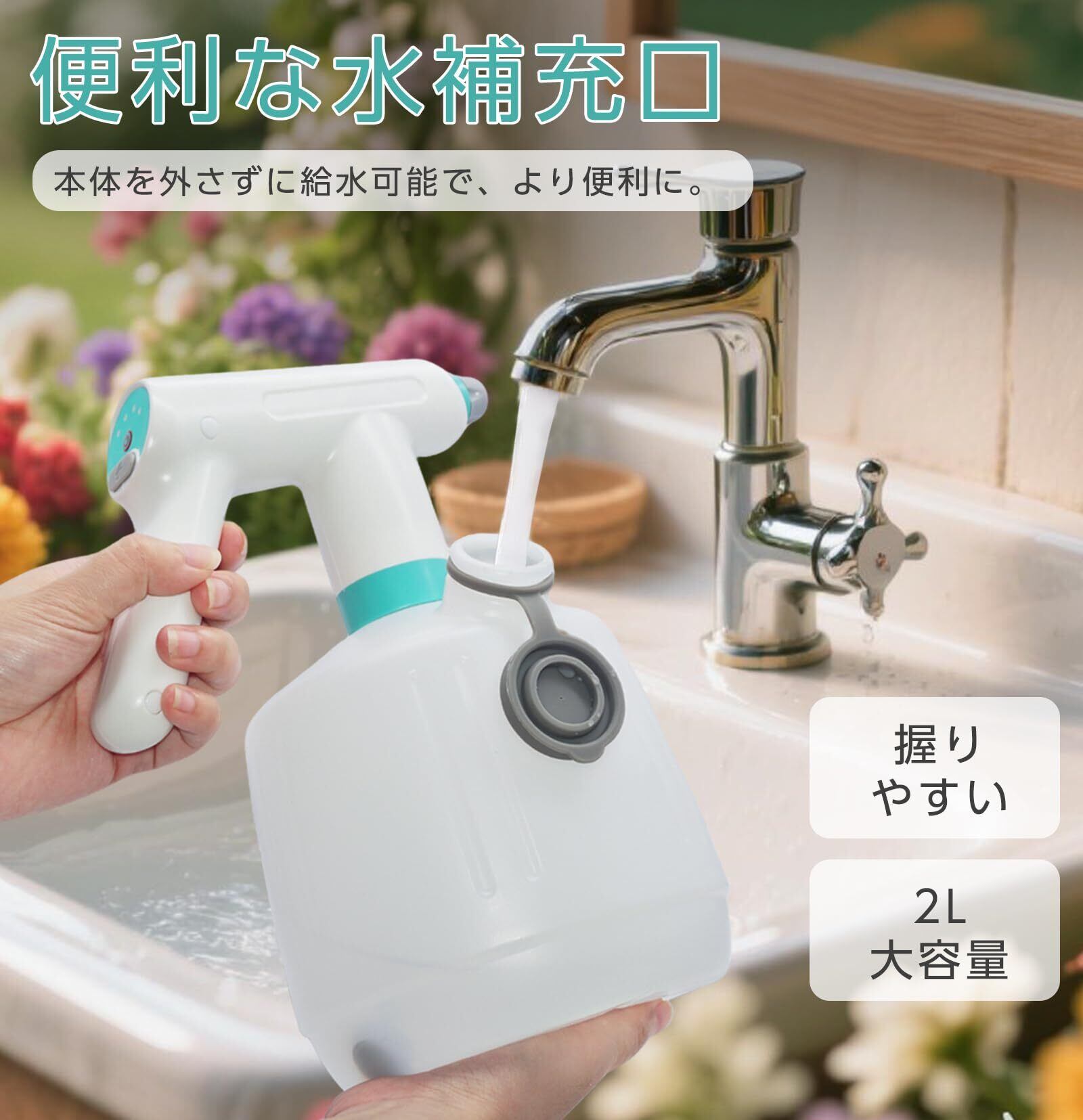 【革新的設計】電動式じょうろの新定番!加圧不要でボタン操作ひとつで、指に優しい軽いタッチで連続噴霧。2L大容量タンクを搭載し、園芸・農薬散布はもちろん、お掃除や洗車までマルチに活躍します。