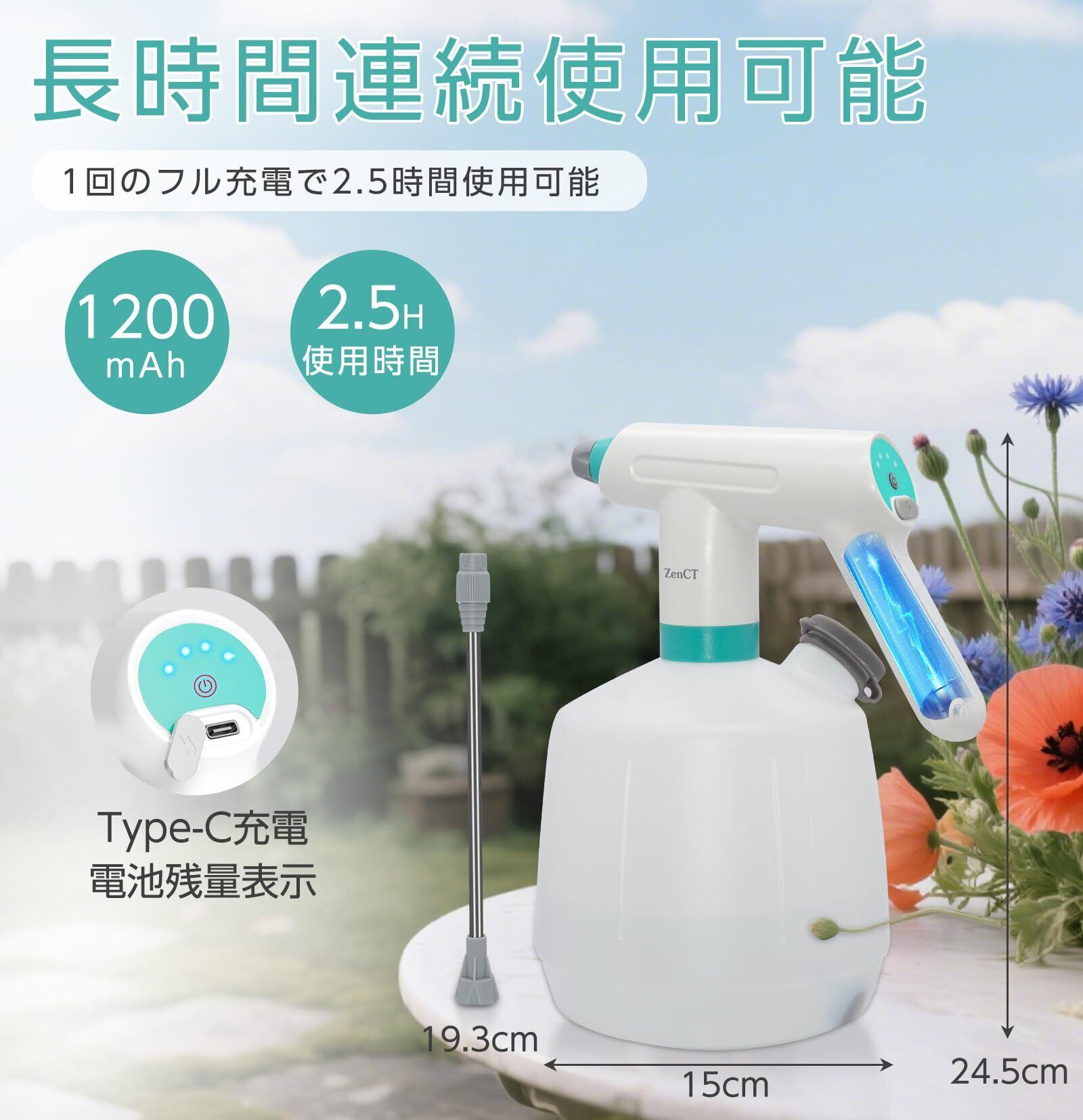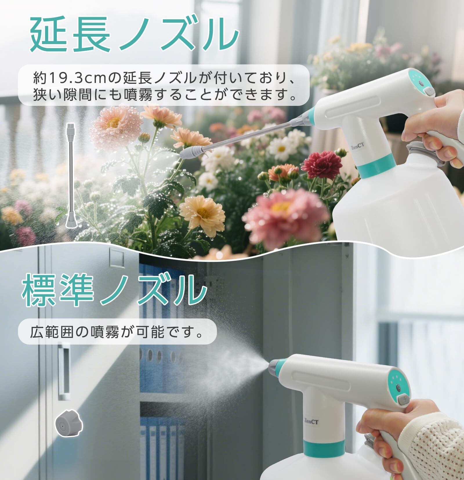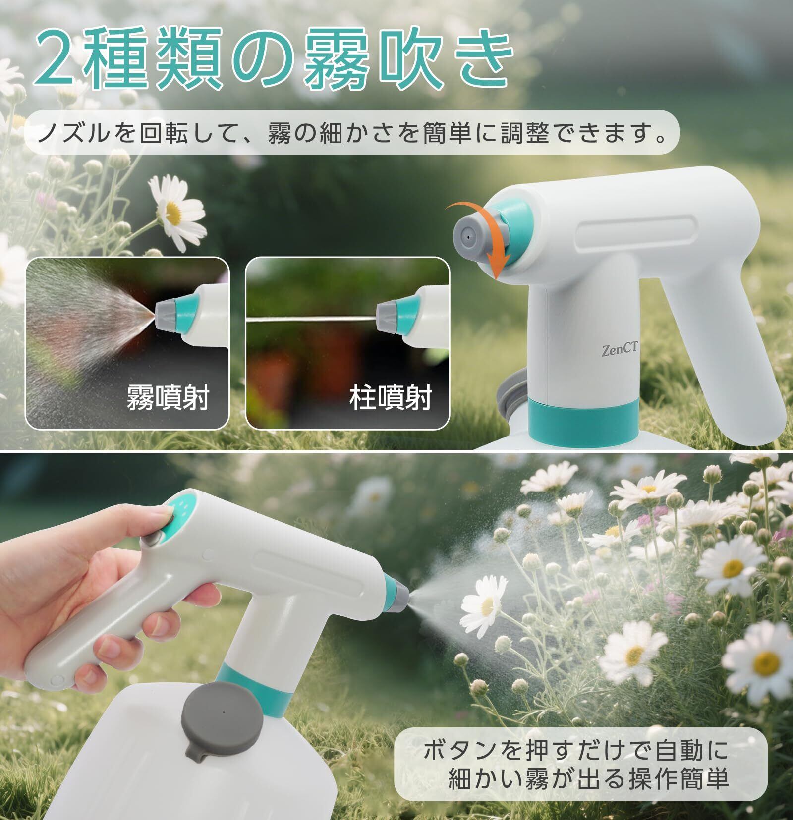 ZenCT 霧吹き 電動噴霧器 じょうろ 【2025年 側面給水口&延長ノズル】 2L 大容量 Type-C充電 ウォータースプレー 2.5時間連続使用可能 蓄圧しなく 電動じょうろ 電動スプレー オシャレ 便利 家庭用 小型 園芸 水やり 除草 消毒 掃除 噴霧 日本語取扱説明書付き CT258