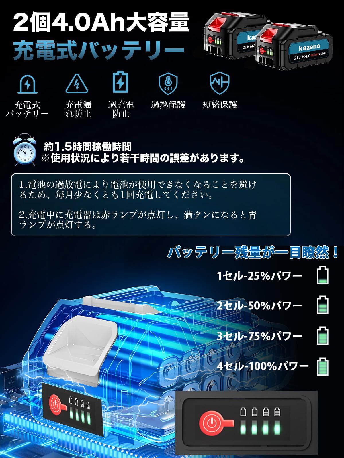 【4000mAh大容量のバッテリー2個搭載& スマート管理機能】この電動草刈り機は、大容量のバッテリーを搭載しており、フル充電で1.5時間利用可能。2つのバッテリーで2時間連続ご利用頂けます。作業をスムーズに完了させることができます。また、マキタ21Vバッテリーと互換性があり、さまざまなニーズに対応できます。LEDディスプレイで残量を常時確認可能なインテリジェント設計です。安全な草刈機 として家庭/業務用に最適です。また、父の日のプレゼントとしての最適な選択肢でもあります。※ご注意:使用時間は、草や枝の太さによって異なります。また、長時間の輸送中に電力が消耗していますので、商品到着後初めてご使用になる前に、必ずー度フル充電してからご使用ください(3-4時間充電)。