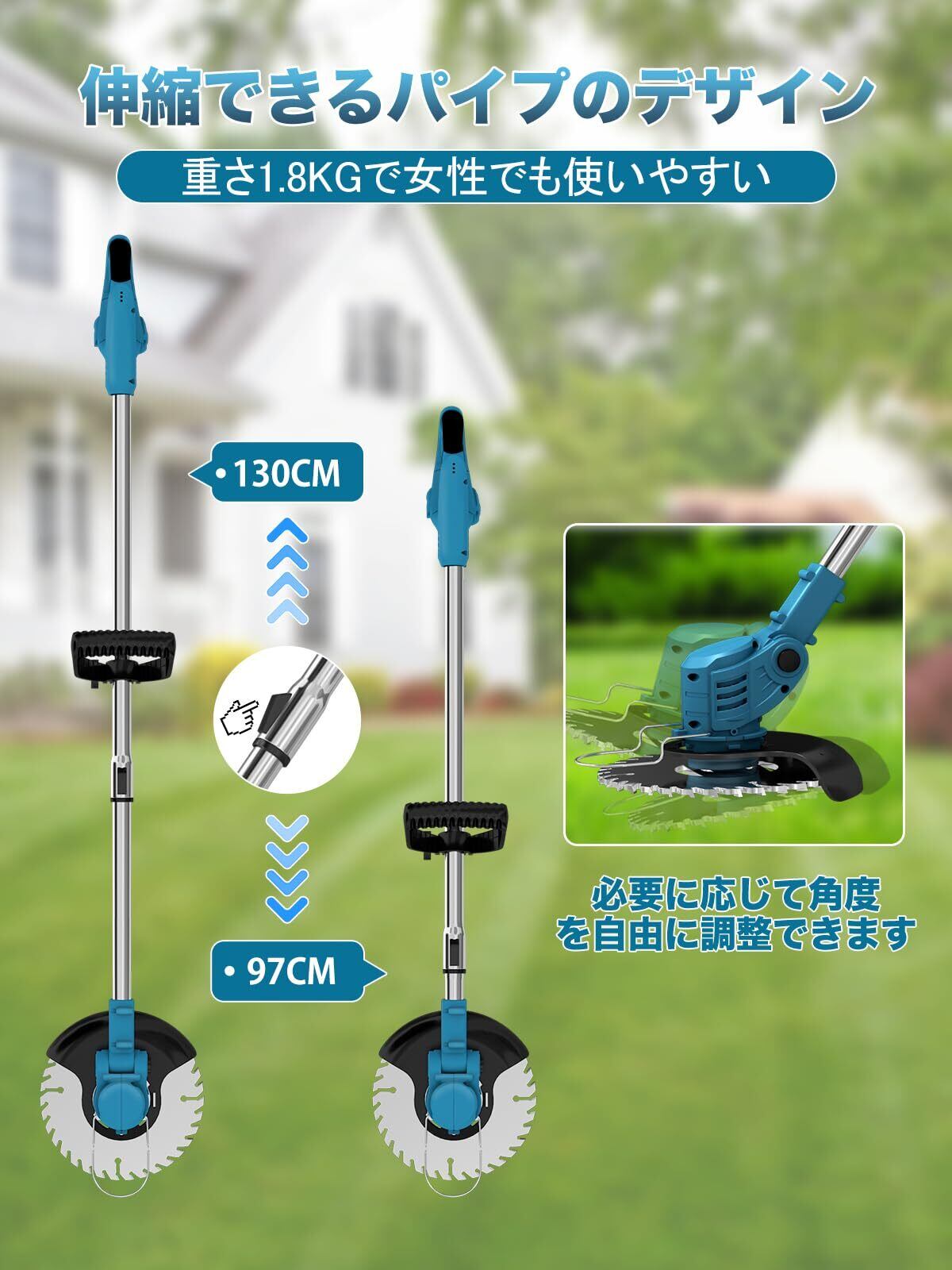 2025新登場 草刈り機 充電式 コードレス 芝刈り機 4000mAh大容量バッテリー2個付属 軽量 電動草刈り機 LED電池残量表示付 高効率チップ 多地形 伸縮 角度調整 4種類の替刃で芝生 枝切り 畑 雑草 植木対応 家庭用 農業園芸用機器 日本語説明書付