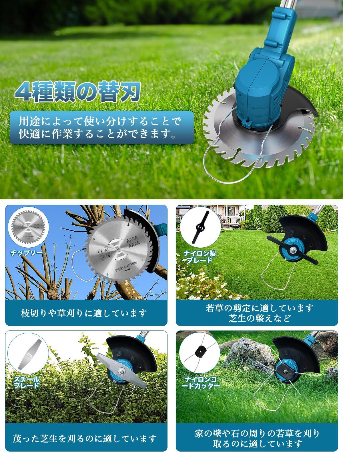 【1 台で 4 役!新進化の多機能電動芝刈り機】新たにアップグレードされた一体型芝刈り機をお届けいたします。4 種類の切断ブレードを搭載しており、様々な草刈り・剪定ニーズに対応できます。① 丸鋸刃:丈夫な低木や太い枝の剪定に最適です。② 金属刃:頑丈な雑草や小さな低木をスムーズに切断できます。③ プラスチック刃:柔らかい草や雑草をきれいに刈り取ります。④ スプール:繊細な芝生にも優しく、精密な刈り込みが可能です。これまでの草刈り作業の負担は過去のもの!この 1 台で日常の掃除や庭の手入れが簡単に済みます。ぜひ、家族みんなで楽しく庭仕事を楽しんでください!