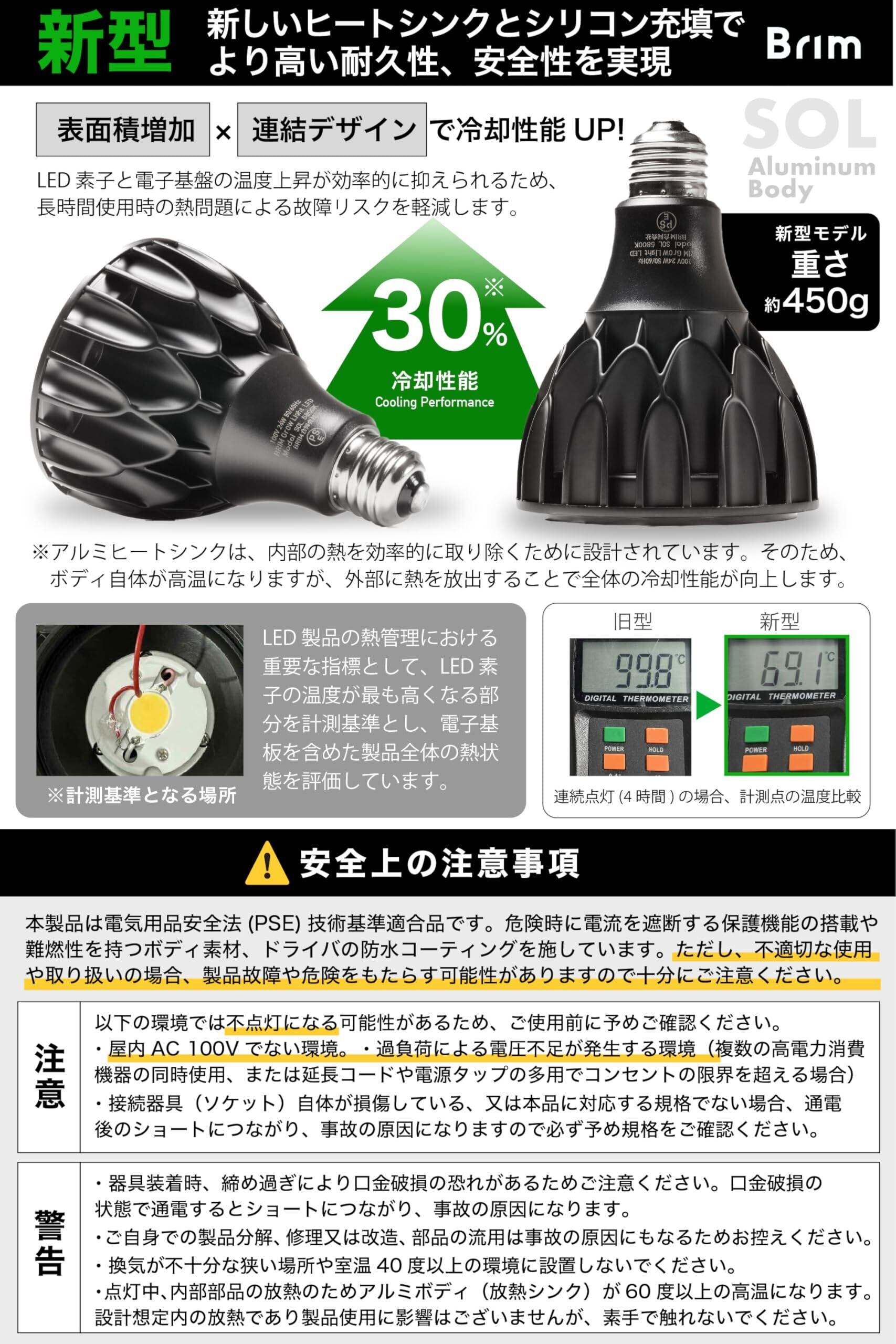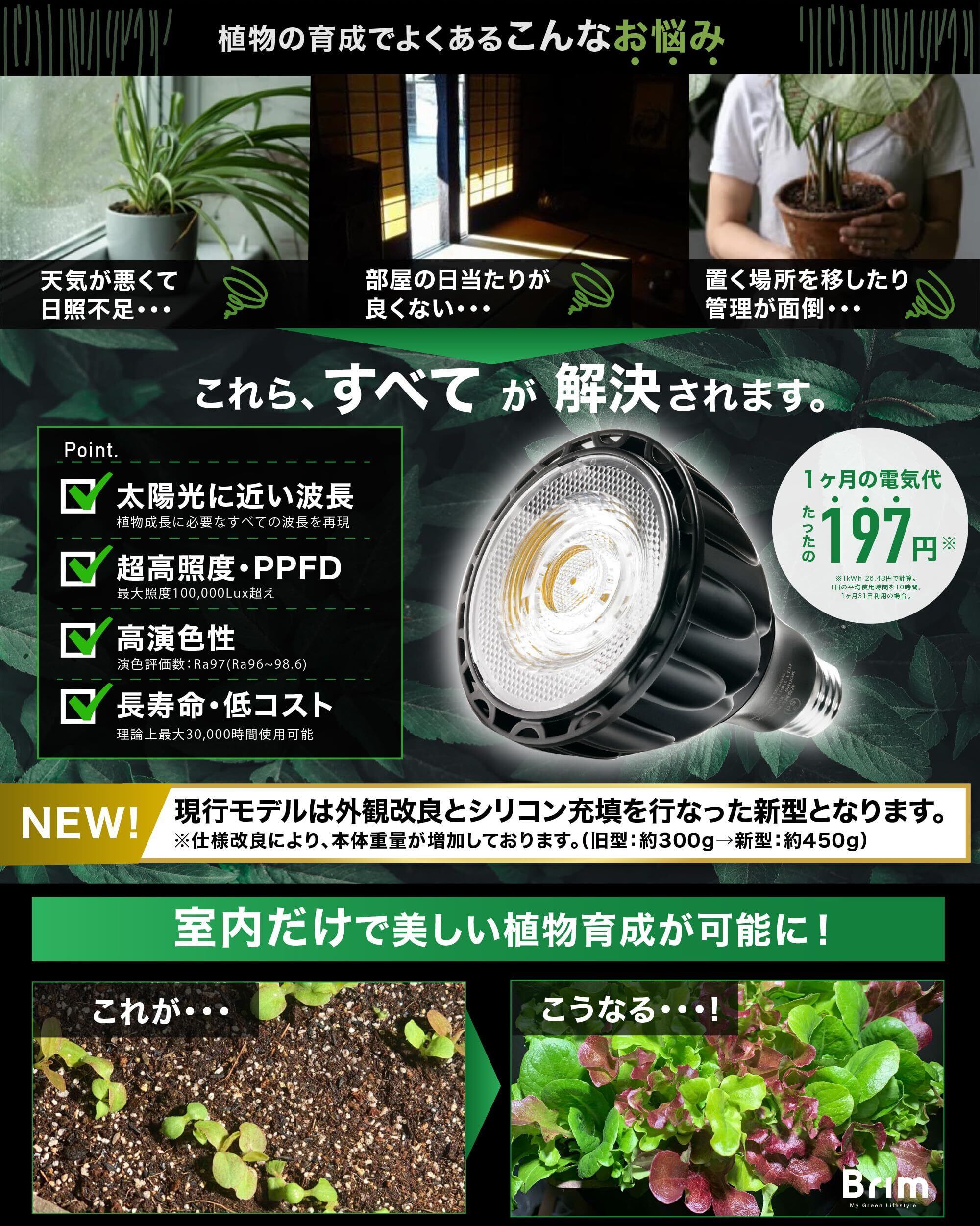 現行モデルは外観アップデートとシリコン充填を行なった新型となります。仕様改良により、本体重量が増加しております。(旧型:約300g→新型:約450g)【室内での育成が楽になる植物育成ライト】観葉植物や野菜等の室内育成に大活躍の植物育成ライト。植物を育てていて、こんな経験ありませんか?悪天候が続いて日照不足だったり、部屋の日当たりが良くなかったり、置く場所を移したりと管理が面倒だったり…初心者の方から上級者の方まで満足いただけるよう今回のBRIM SOL 24W led植物育成ライトでは「高性能×使いやすさ」の両立にこだわり、最新チップ導入とレンズ設計の見直しで大幅に性能が向上しました。電球と同じようにソケット部を回し込んでカンタン装着。的確なピンポイント照射で照らしたいエリアや距離のコントロールがしやすくなりました。