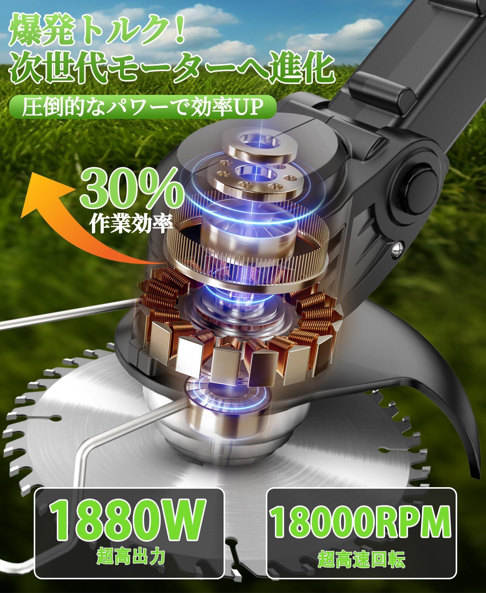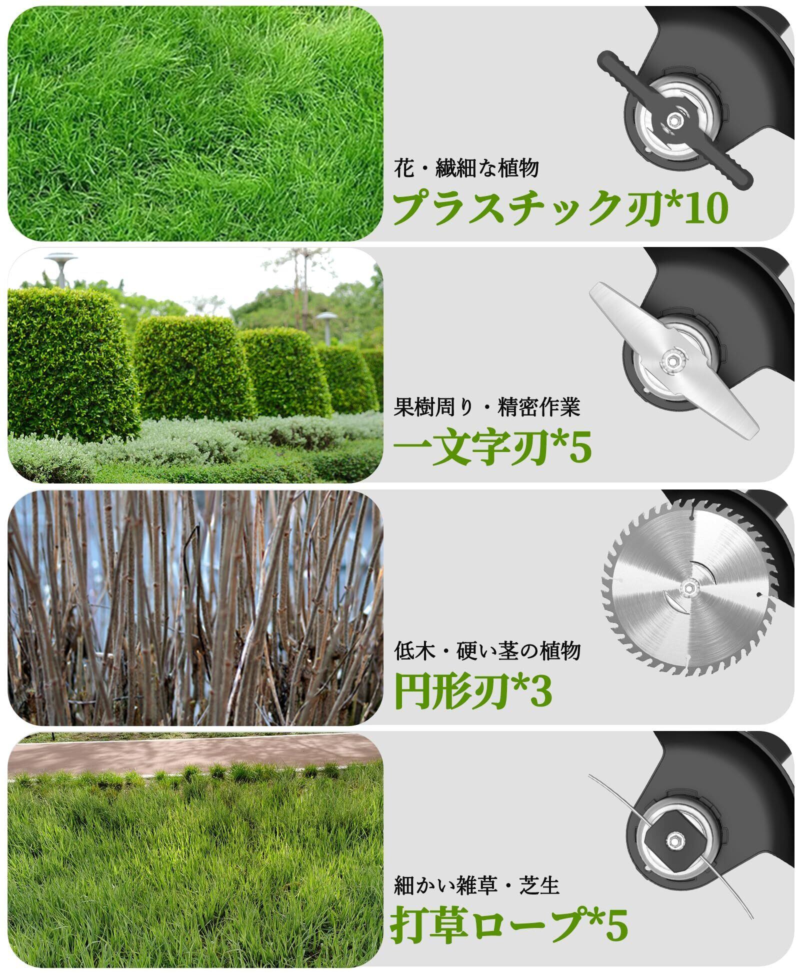 1. 高出力モーターで効率的な草刈り:当社の草刈り機 充電式は、21V大容量バッテリーと1880W高出力銅芯モーターを搭載。芝生・雑草・稲わら・麦わら・低木など、多様な植物の刈り取りに最適で、4種類の用カッター(打草ロープ×5、円形刃×3、プラスチック刃×10、一文字刃×5)を用途別に選択可能。従来の草刈機と比べて作業効率を30%以上向上させます。軽量設計でありながら安定したパワーを発揮し、広範囲の農地作業から花壇周りの精密作業まで、あらゆるシーンで高い切削性能を実現します。