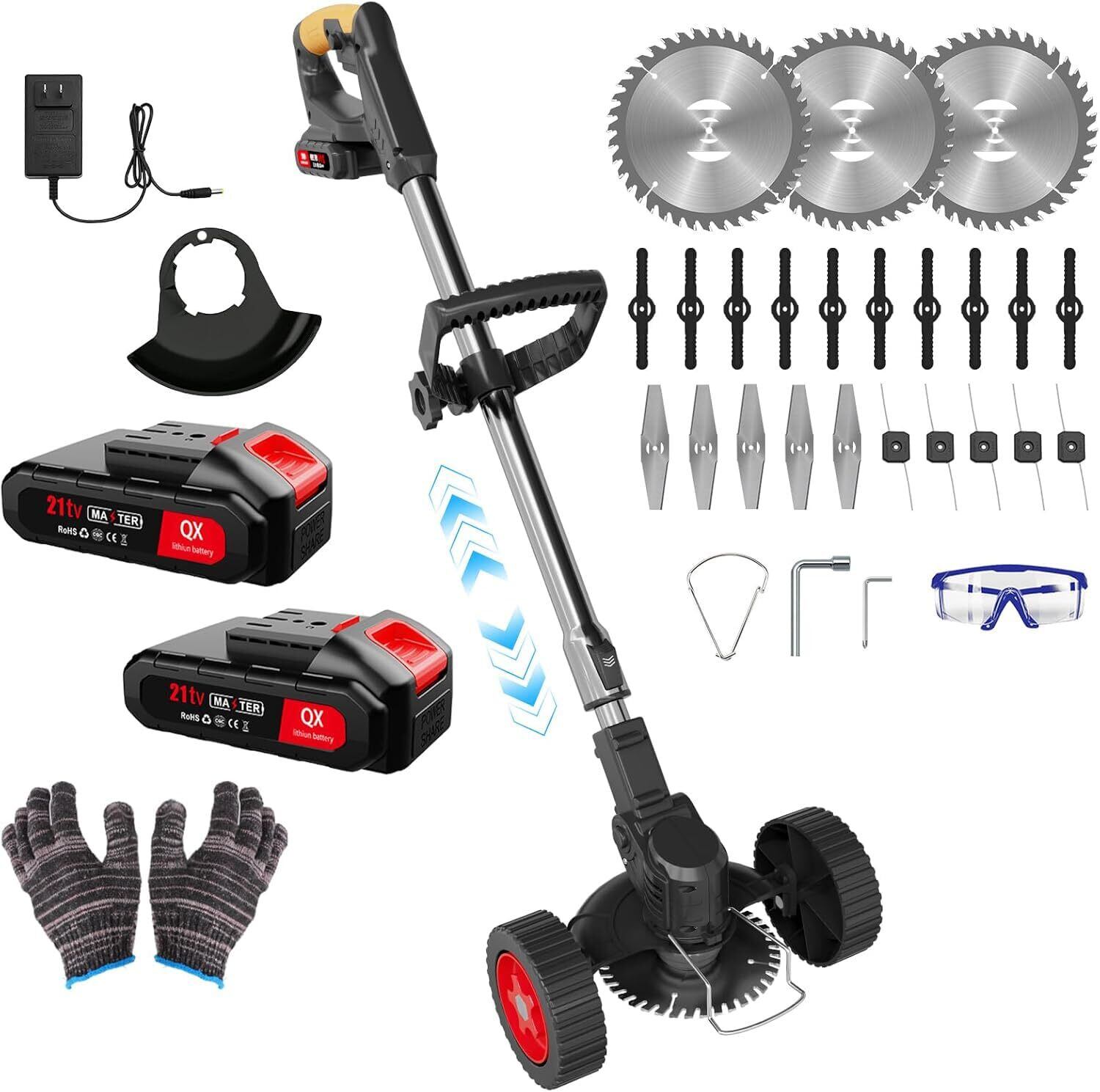 6. 充実の製品パッケージ&使用上の注意:本製品のパッケージには、草刈り機本体1台、21Vバッテリー2個、保護メガネ1副、打草ロープ5個、円形刃3枚、プラスチック刃10枚、一文字刃5枚、手袋1組、補助車輪1組、取付ネジセット1式、防飛散カバー1個、充電器1個が含まれています。使用時は、植物の硬さに応じて適切な刃を選択し(硬質植物には金属刃を推奨)、バッテリーを過放電状態で保管せず、使用後は刃の残留物を清掃してください。また、幼児の手の届かない場所に保管し、作業時は必ず保護メガネを着用してください。本製品は直径3cm以上の樹木の切断には対応しておりません。