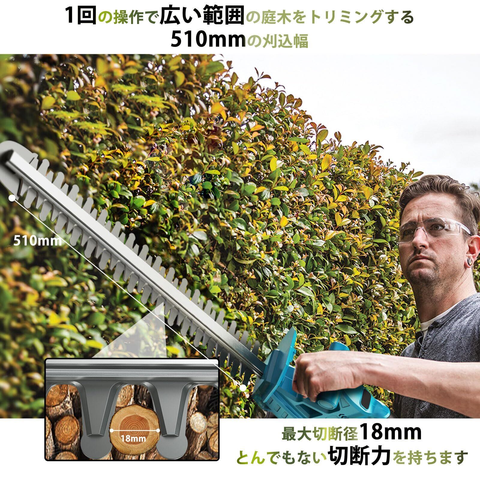 ヘッジトリマー 充電式 電動ヘッジトリマー 18Vマキタバッテリー対応可能 刈込幅510mm/切断径18mm 両刃駆動 高速往復刈り 剪定 トリマー 電動トリマー ガーデントリマー 生け垣トリマー 剪定バリカン 生垣バリカン 植木バリカン 草刈りバリカン 充電式 枝切り 電動 コードレス 軽量 【大容量バッテリー2個と充電器付属】 日本語取扱説明書