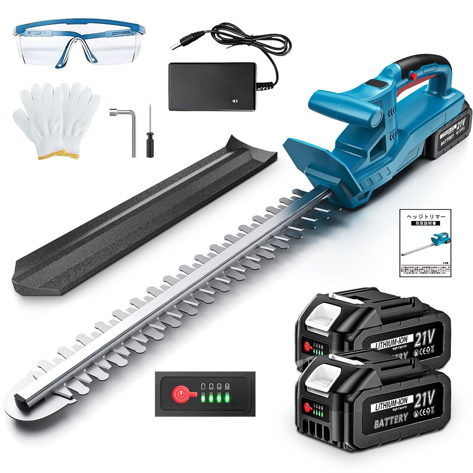 【付属品とアフターサービス】付属品:ヘッジトリマー本体x 1、ブレード収納ケースx 1、大容量リチウムバッテリーx 2、充電器x 1、保護メガネx 1、手袋x 1、ドライバーx 1、レンチx 1、日本語取扱説明書x 1 。出荷前に厳格な品質検査を行われますが、万が一、お手元に届いた商品に欠陥がある場合は「注文履歴」➡「出品者に連絡する」。担当者が24時間以内返信し、真摯に対応いたします。