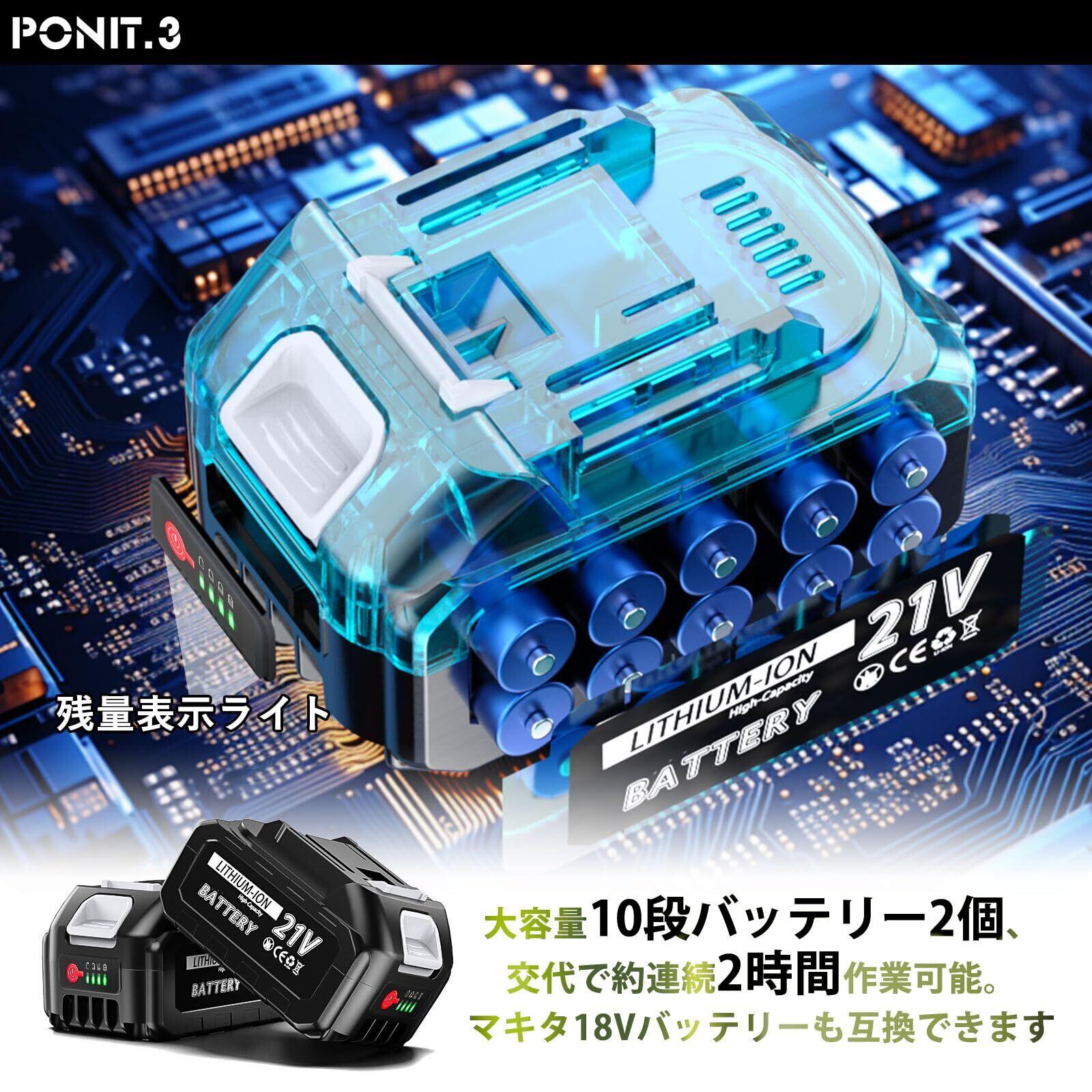 【大容量バッテリー2個/残量表示LEDライト】大容量リチウムバッテリー2個を付属する電動ヘッジトリマーです。使用場所を選ばず、フル充電されたバッテリー1個分の作業時間は約1時間ほど、2個交代で2時間連続作業可能。マキタ18Vバッテリー(BL1820b、BL1830、BL1840、BL1850、BL1860B)と互換性があり、バッテリーに残量表示ライトがついていますので、作業時間を把握できます。