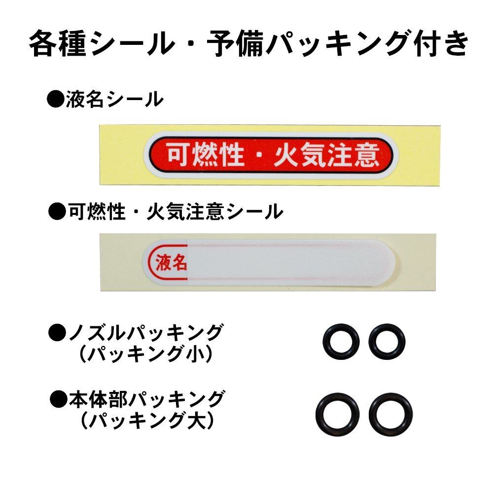 有機溶剤・防錆剤・有機溶剤系クリーナー・しみ抜き剤等の噴霧ができる。