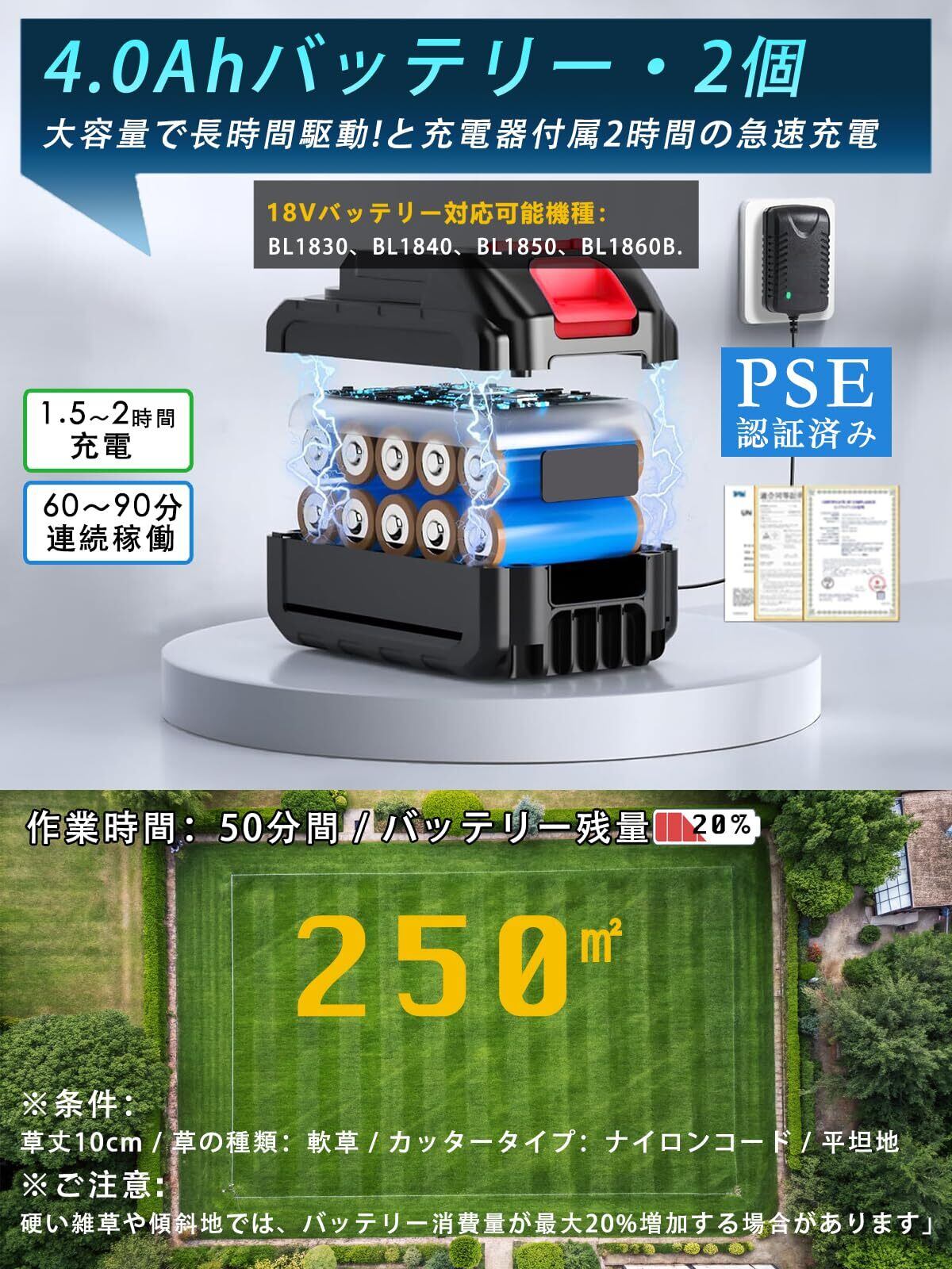 ❹ 2個セット大容量バッテリー & スマート管理機能「▼PSE認証済み4.0Ahバッテリー2個付属で約1.5時間連続稼働。▼6段階保護機能(過充電/過放電/過電流/過電圧/温度/短絡)搭載。▼LEDディスプレイで残量を常時確認可能なインテリジェント設計です。草刈り機 充電式 安全な草刈機 として家庭/業務用に最適です。」
