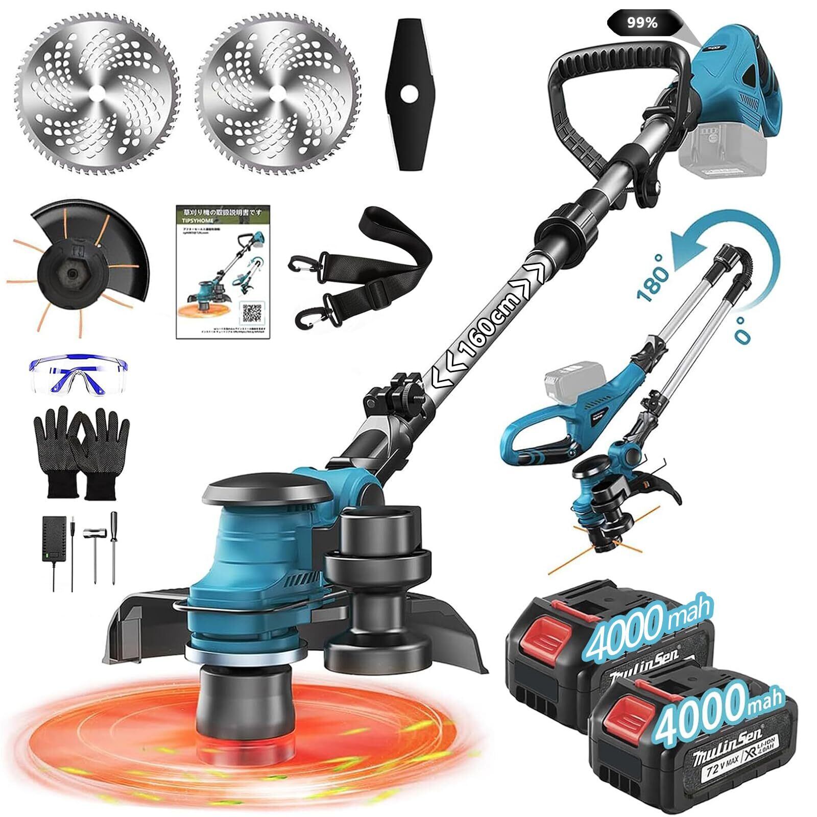 【2025アップグレード】電動 草刈り機 充電式 マキタ18V互換 ブラシレスモーター 230mm刃幅 60dB低ノイズ 1.8kg軽量 4000mAh大容量バッテリー2本 LED表示付 【コードレス・折りたたみ式・コンパクト・狭小住宅でも収納可能・操作が簡単】 芝刈り・縁取り対応 庭園用 父の日 ホリデーギフト pse認証 日本語説明書付 青