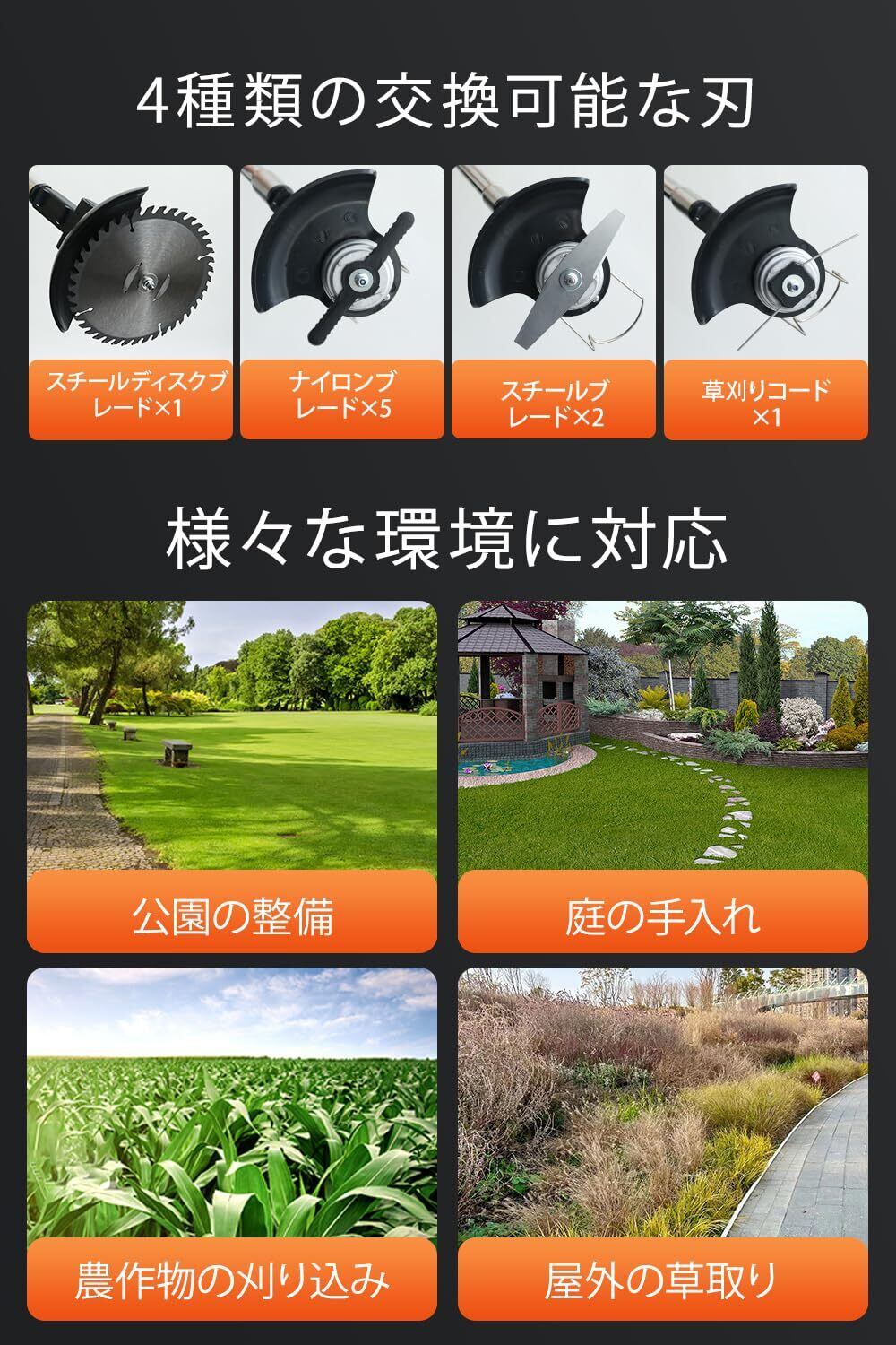 【多様な刃、柔軟な充電式草刈り機の対応】 ナイロン刃、鉄板刃、草刈り刃、鋼刃など、4種類の刃を提供し、公園/庭/野外雑草/作物収穫など、さまざまなシーンのニーズに対応する草刈り機です。速度は調整可能で、異なるタスクに適用できます。高速は強力な刈り込みに適用し、低速は充電式草刈り機の精密作業に適用します。