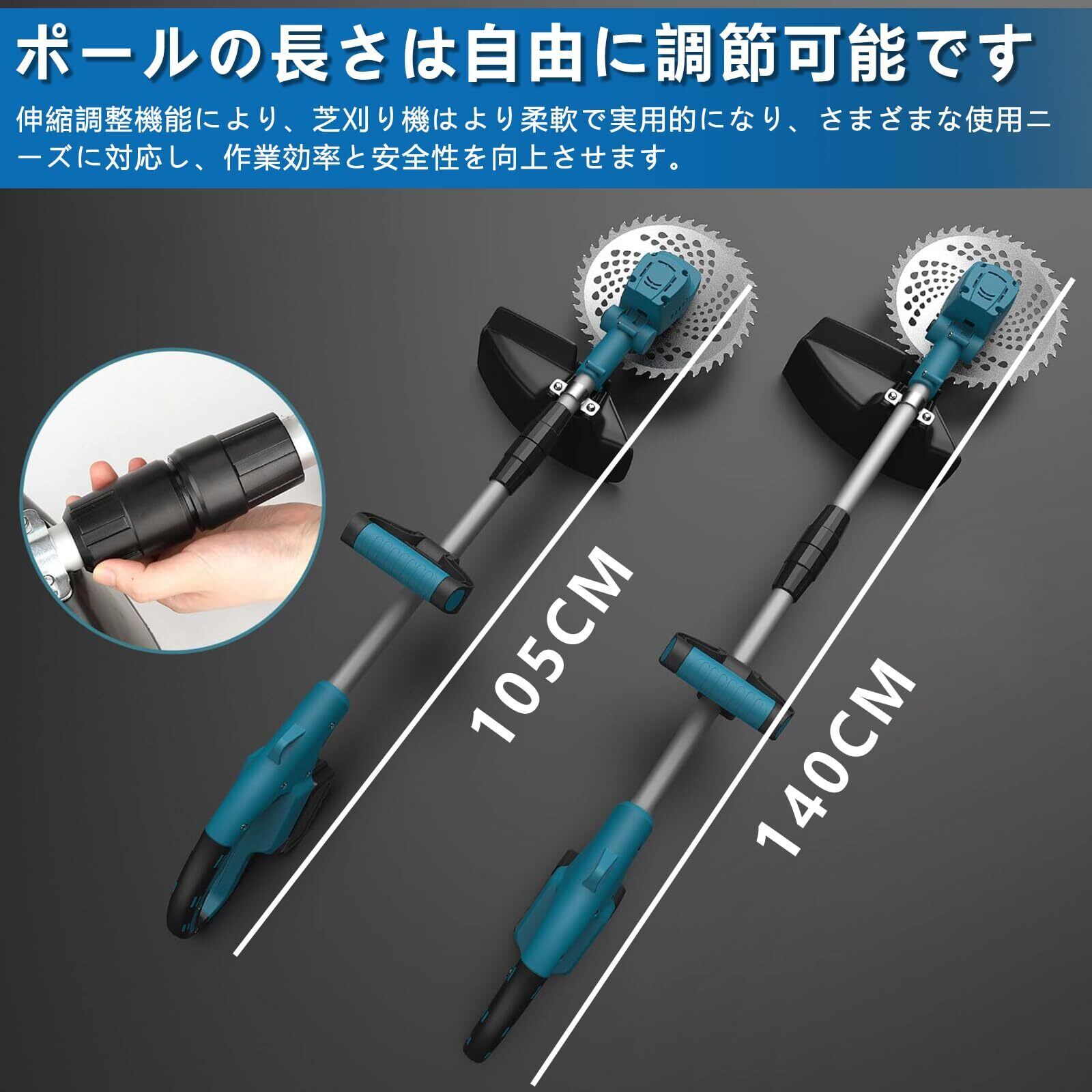 ❹ 多段調整機能 & 3WAYマルチブレード「▼伸縮式くさかりき機ポール(105-140cm) で身長に合わせた▼+180°可動グリップ+90°角度調節可能ヘッドで姿勢に合わせた最適操作草抜き機。腰痛対策 設計草取り機。▼可能刃 3種(15Mナイロン/ステンレス/マンガン鋼)で▼雑草から灌木まで 対応の電動かりばらい機▼多機能lawn mower」