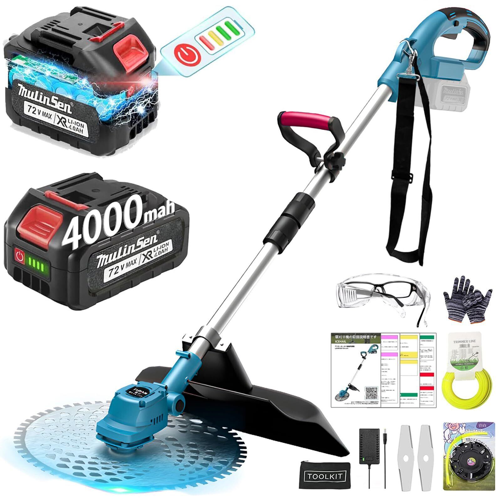 ICEHAIL 電動 草刈り機 充電式 ブラシレスモーター マキタ18V互換 刈込幅255mm PSE認証 2個4000mAh大容量バッテリLED表示付 50dB低騒音 1.7kg軽量肩掛けバンド付 女性 コードレス 芝刈り機 伸縮105-140cm 3種多用途替刃(DIY庭園用広域カット・芝生・雑草・植木・枝切り用) 簡単操作 使用の容易さ 耐久性强 ホリデーギフト 日本語説明書付 青 | KSショップ