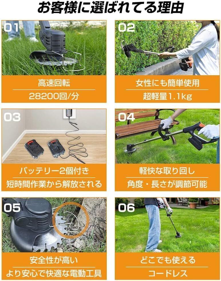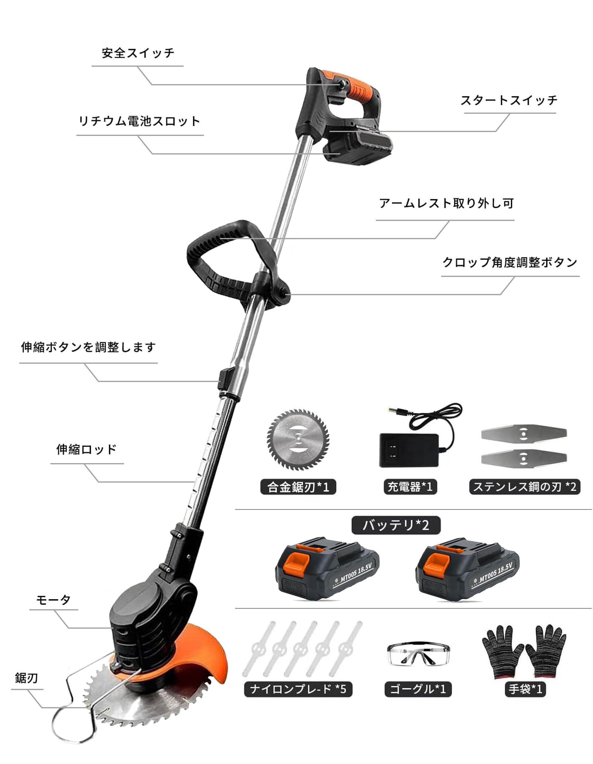 【KAKA】質保一年間 2025新登場 草刈り機 充電式 コードレス 草刈機 大容量バッテリー2個付属 軽量 電動草刈り機 高効率チップ 多地形 伸縮 角度調整 4種類の替刃で芝生 枝切り 畑 雑草 植木対応 家庭用 日本語説明書付