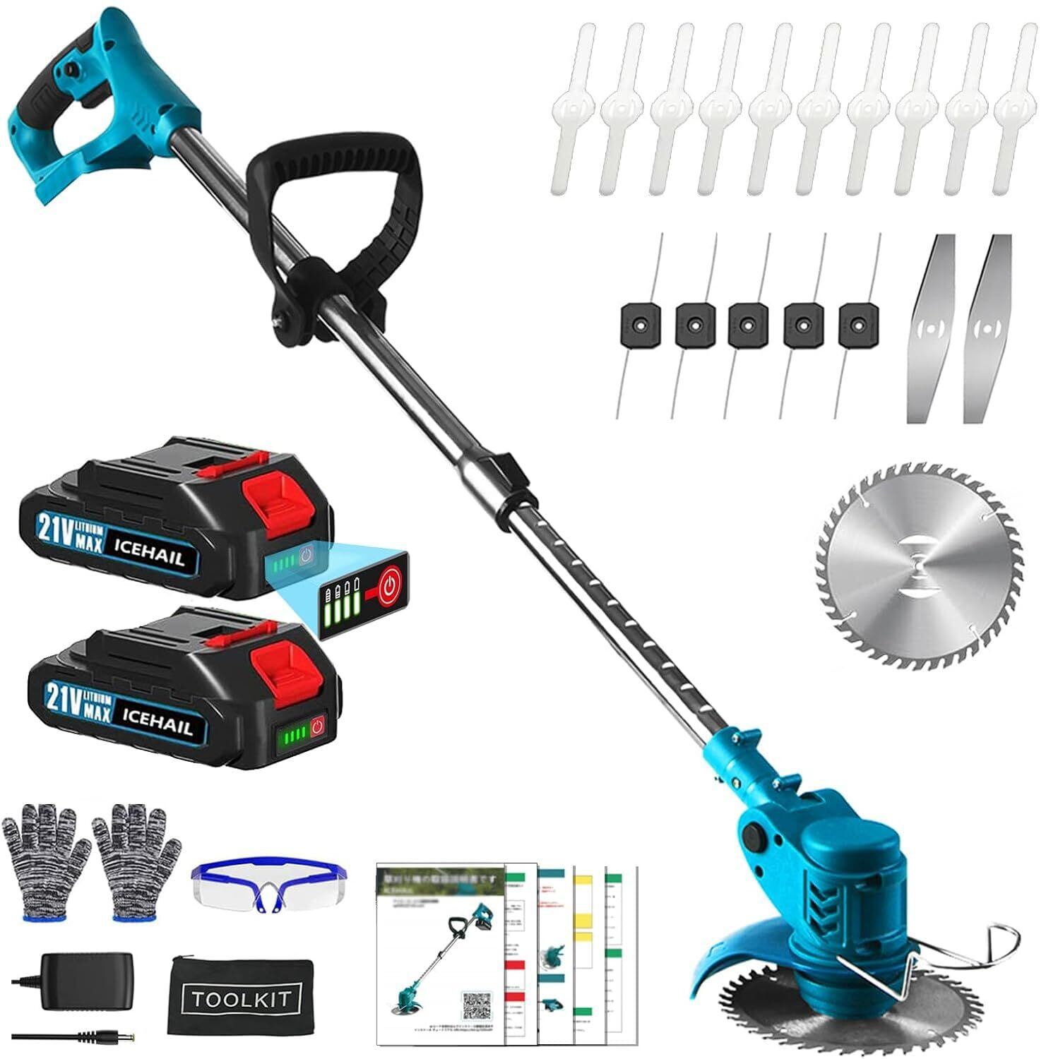 ■ パッケージ内容:充電式刈払機本体×1、6インチチップソー×1、鋼刃×2、ナイロン刃×10、ナイロンコードカッター×5、▼PSE認証リチウムバッテリー×2、充電器×1、保護メガネ×1、工具セット×1、取扱説明書×1(▼日本語マニュアル付属)