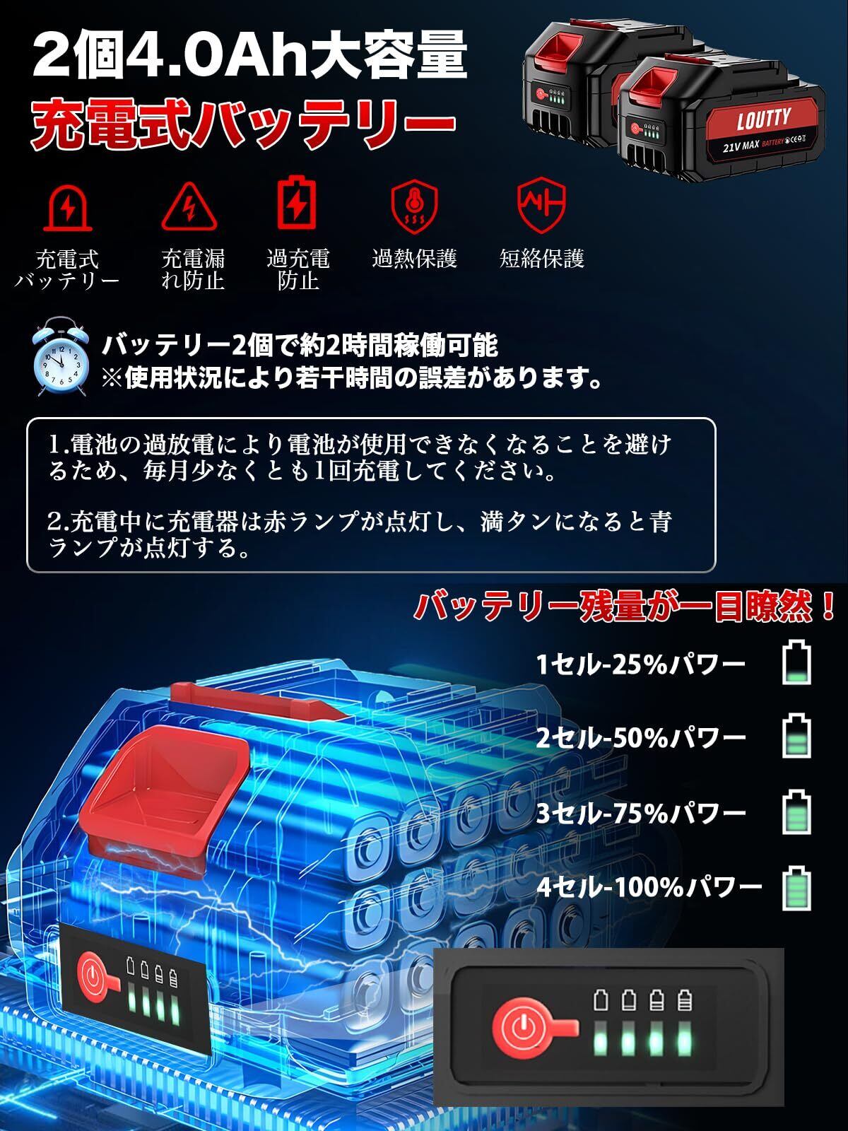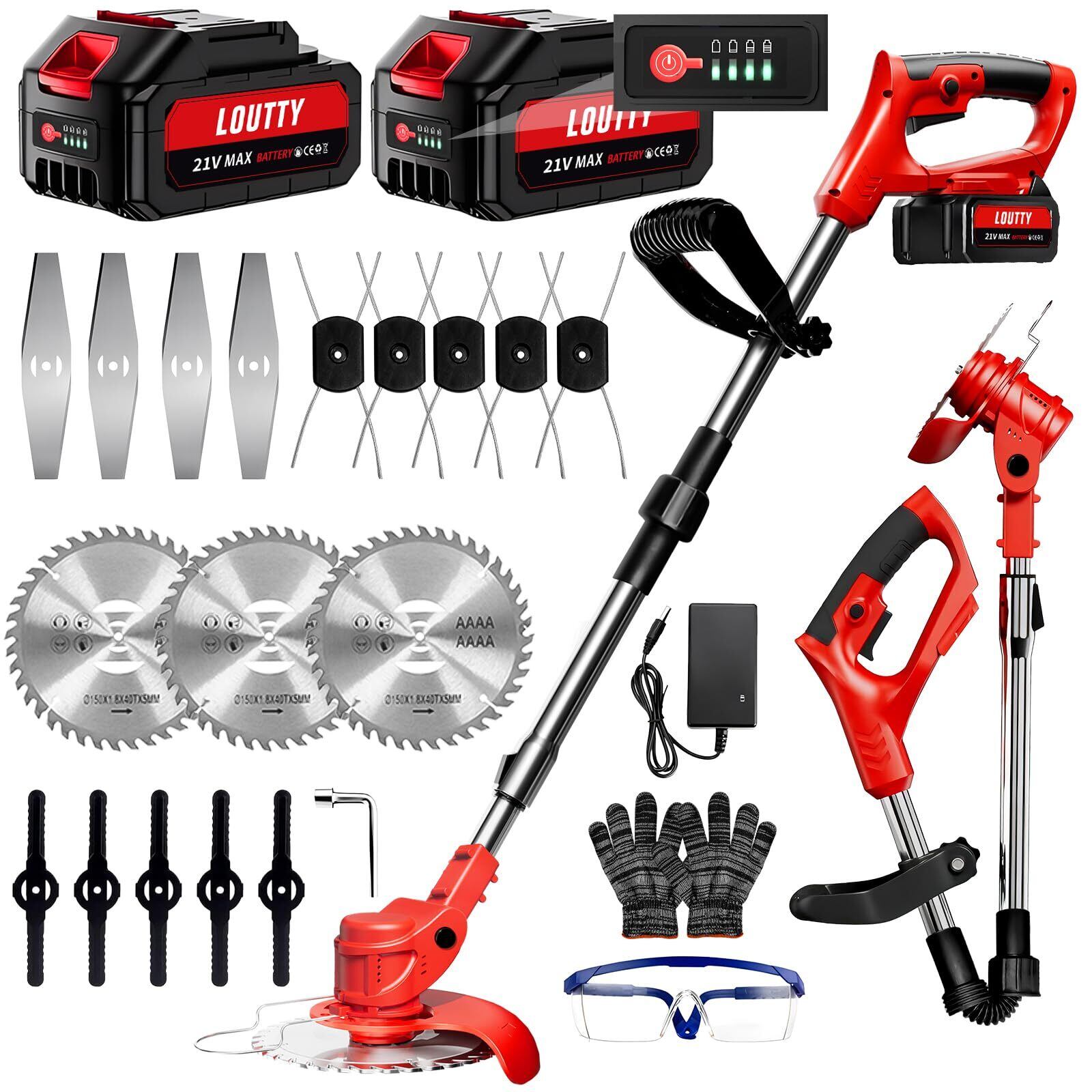 Loutty 草刈り機 充電式 コードレス 4000mAh大容量バッテリー2個搭載 【2025最新アップデート】マキタ18v電池互換 残量表示 折りたたみ式 草刈り機 電動 充電式草刈り機 角度調整 伸縮可能 4種替刃 軽量 安全設計 除草 枝切り 雑草 芝生 畑 植木 家庭用 女性でも簡単 除草 2時間運行 日本語説明書付き