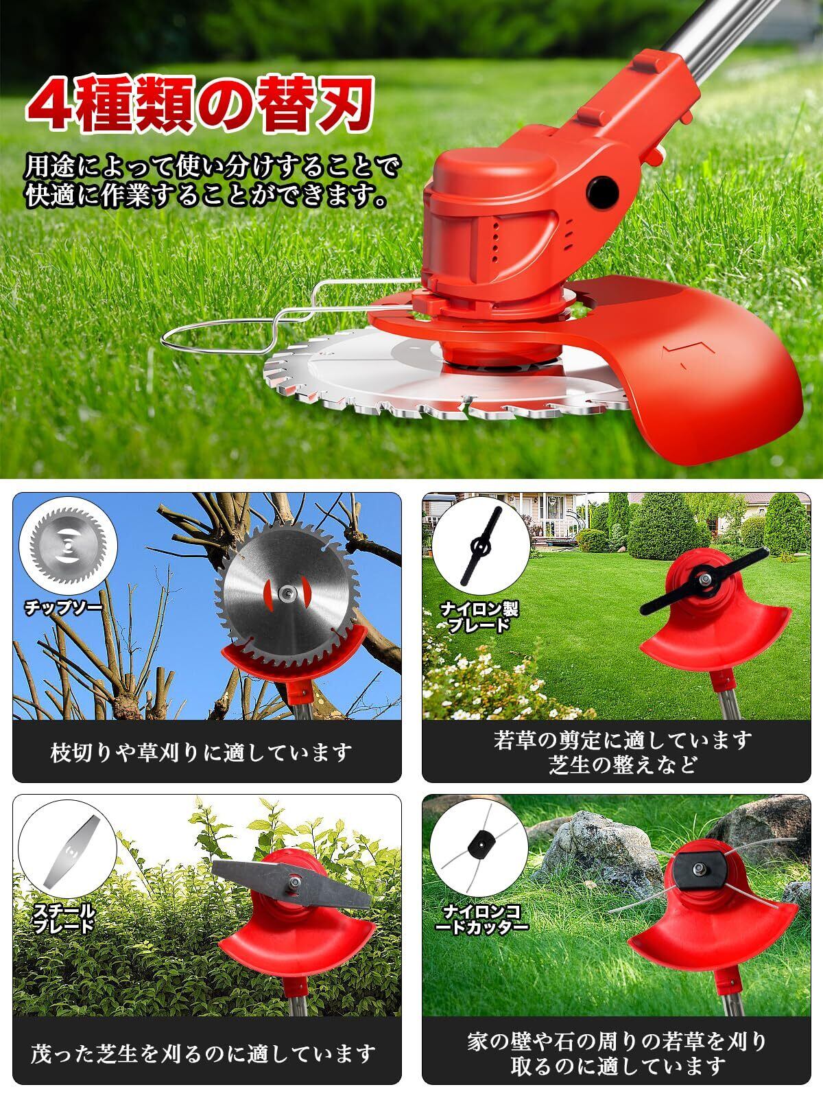 【4種類の替刃でさまざまなシーンに対応可能】 刃の切り替え機能により、さまざまなシーンに対応できます。壁に適したナイロンコードカッター、芝生用のナイロン製ブレード、厚い雑草や小さな植物を切るためのスチールブレード、厚い低木や木の枝を整えるのに適したチップソーなどが含まれています。庭園、樹木の植樹、花壇、歩道、景観の美化などお役に立てます。Loutty草刈り機の4種類の刃の設定により、さまざまな園芸作業を簡単にこなすことができ、時間と労力を節約できます。