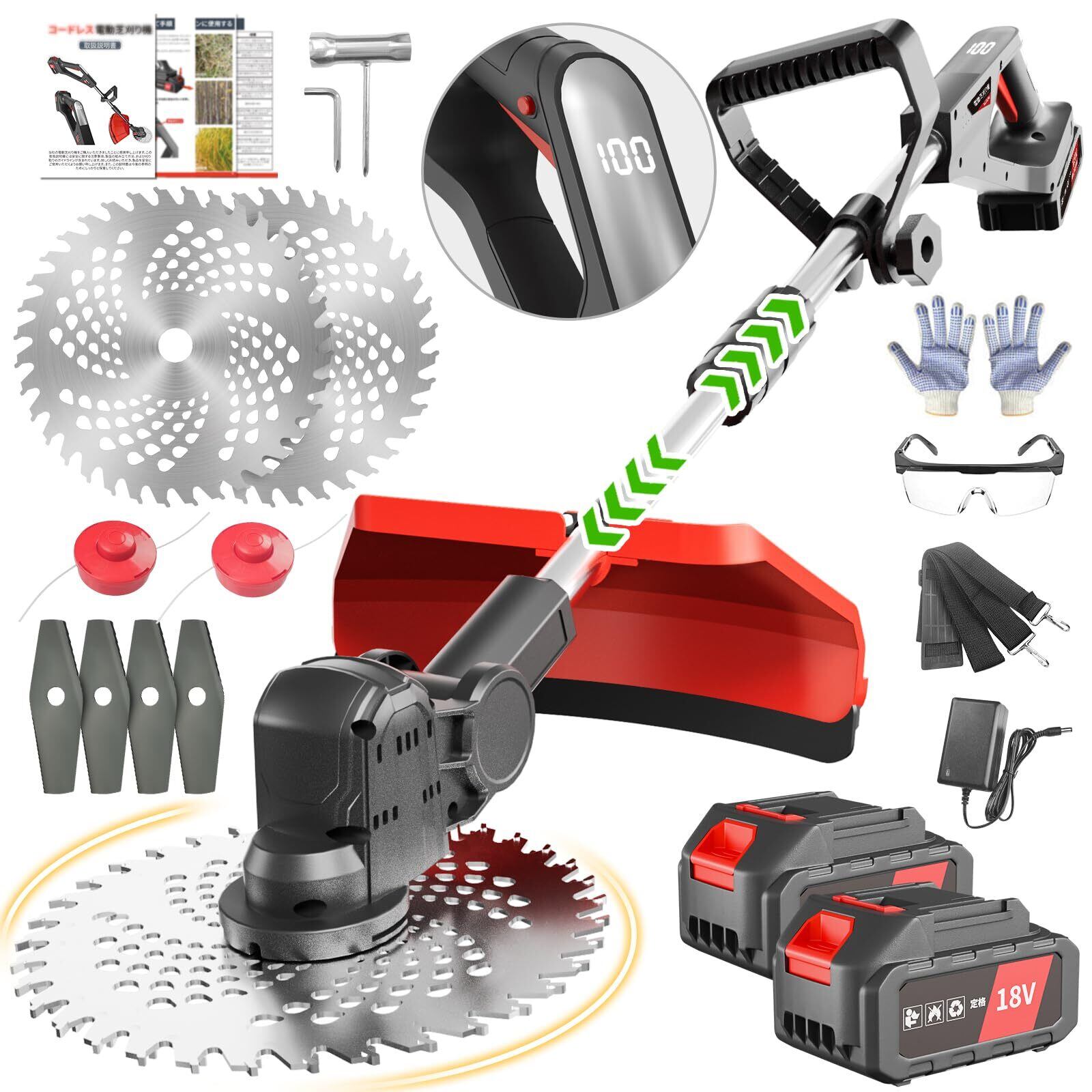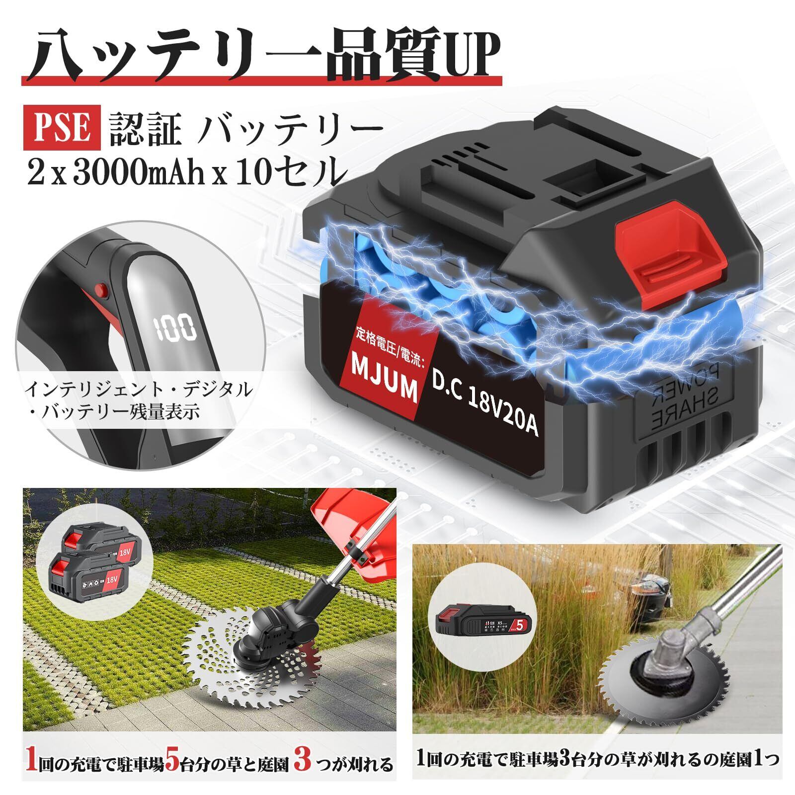 充電式草刈機【海洋造園会社の熊本氏監修】18Vコードレス草刈り機 刈込幅230mm LED電池残量表示 PSE認証済 3000mAhバッテリー2個付き 20000rpm ブラシレスモーター 電動芝刈り機 3種類の替刃 伸縮110-142cm 90度角度調整 補助ハンドル 肩掛けバンド 多機能刈払機 低騒音 枝切り 除草 芝生 畑 雑草 植木 庭 園芸 公園 多地形 安全軽量 日本語説明書 | KSショップ