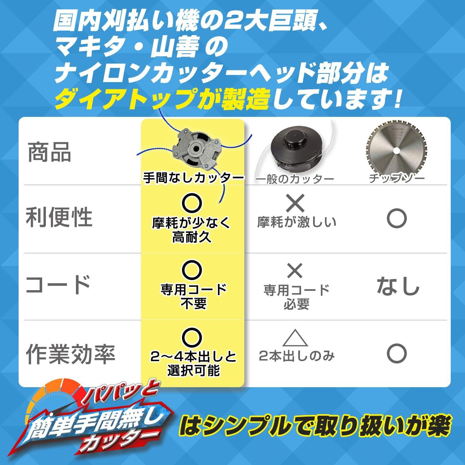 分解不要、本体から取り外し不要でナイロンコードを差し込むだけで草刈りができる「ぱぱっと簡単手間なしカッター」とにかく簡単!手軽に草刈り!がコンセプトのアイテムです。 ①コードを差し込むだけで使える:分解不要!簡単コード!コードホルダーを押してナイロンコードを差し込むだけ! ②耐久性3倍:国内刈払い機の2大巨頭、マキタ・山善のナイロンカッターヘッドはダイアトップが製造しています!フリー回転のカップにより底辺の摩耗が少なく 通常のナイロンヘッドより摩耗しにくく3倍長持ちです!※当社調べ ③国内ほぼ全ての刈払い機対応:取付け部が丸穴タイプのため、国内ほぼ全ての刈払機に取り付可能です。 刈れる草は・芝生(グラウンドカバー)・低木(ツツジ、サツキ、ヒイラギナンテン、ボケ、アベリア等)・雑草(スギナ、オオバコ、ドクダミ、カラスノエンドウ、ハコベ、ヨモギ等)です。 刈れる場所は・フェンスの際・隙間の草・コンクリートの際など様々なシーンで利用可能です。 【本体仕様】 ・手差し式のナイロンコードカッターになります。 ・本体サイズ:外形サイズ 縦 約7.5cm×横 約10cm×高さ3cm 本体重量 約198g/ 取付け穴 直径 約12.3mm/取付け部:25.5mm/使用工具径30mm以下 【その他】 ・直径換算で3mm以下のナイロンコードを使用ご使用ください。 ※EX10用ツイストナイロンコード 2.7mmまたはEX12用ツイストナイロンコード 3.0mmを推奨します。