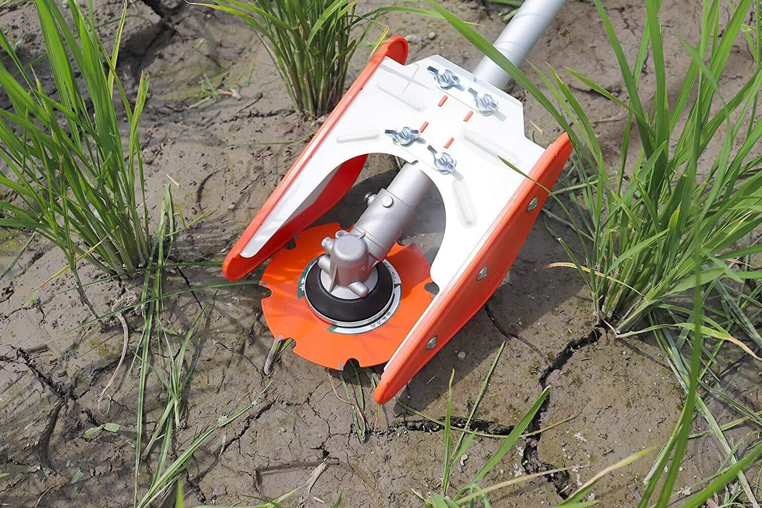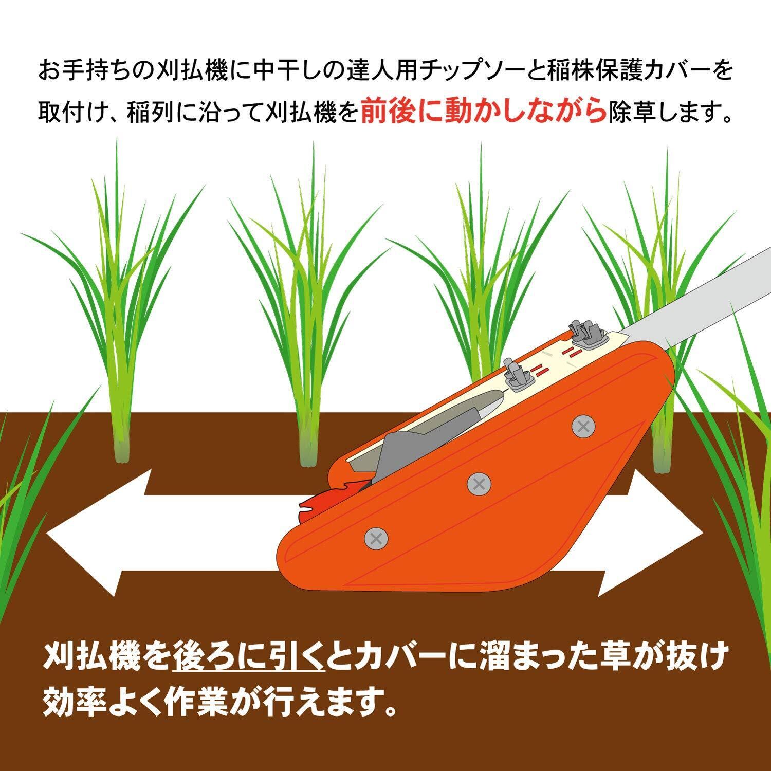 刈払機に取り付けた中干しの達人用チップソーと稲株保護カバーが稲株を守り、水田の中干し時期の除草を助けます。 直径130mmの中干しの達人用チップソーは小径で手軽なため、除草しにくい株間の隅々まで簡単に除草できます。 ・刈高さの調節可能 ・エンジン刈払機に取り付け簡単 ・畑(大豆・とうもろこし・にんにく)でも便利! ◆株間15㎝以上に最適!カバーが稲を守ります。